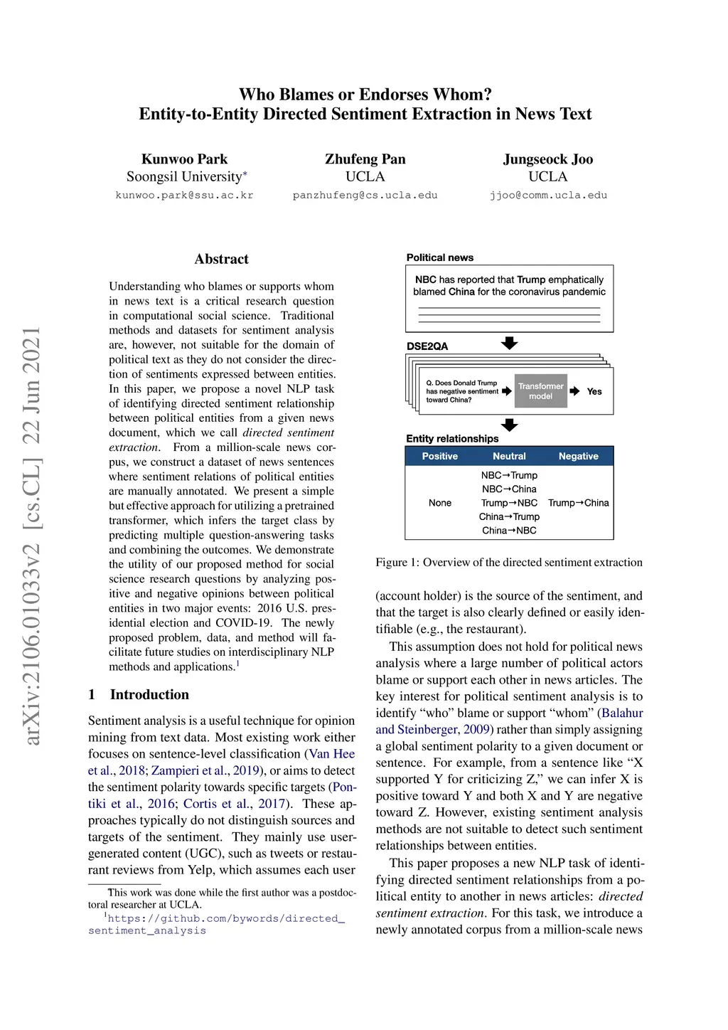 Understanding who blames or supports whom in news text is a critical research question in computational social science. Traditional methods and datasets for sentiment analysis are, however, not suitable for the domain of political text as they do not consider the direction of sentiments expressed between entities. In this paper, we propose a novel NLP task of identifying directed sentiment relationship between political entities from a given news document, which we call directed sentiment extraction. From a million-scale news corpus, we construct a dataset of news sentences where sentiment relations of political entities are manually annotated. We present a simple but effective approach for utilizing a pretrained transformer, which infers the target class by predicting multiple question-answering tasks and combining the outcomes. We demonstrate the utility of our proposed method for social science research questions by analyzing positive and negative opinions between political entities in two major events: 2016 U.S. presidential election and COVID-19. The newly proposed problem, data, and method will facilitate future studies on interdisciplinary NLP methods and applications.