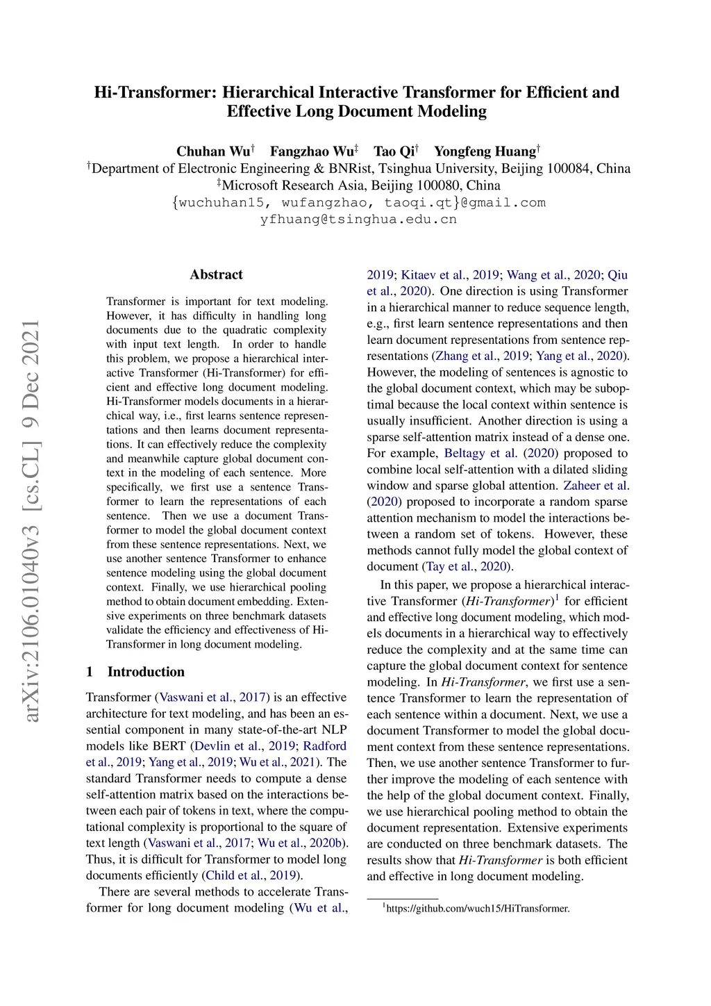 Hi-Transformer: Hierarchical Interactive Transformer for Efficient and