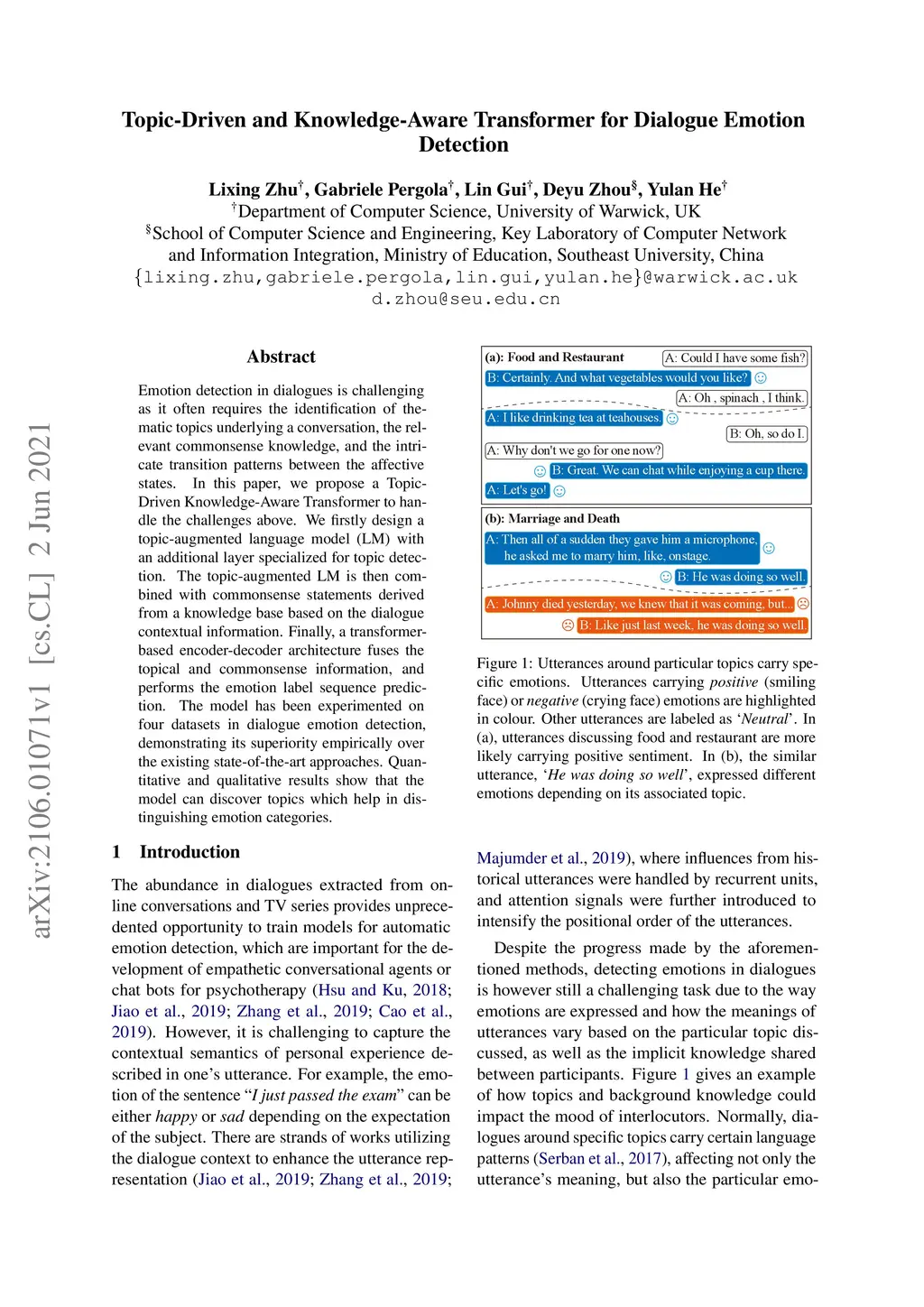 Topic-Driven and Knowledge-Aware Transformer for Dialogue Emotion