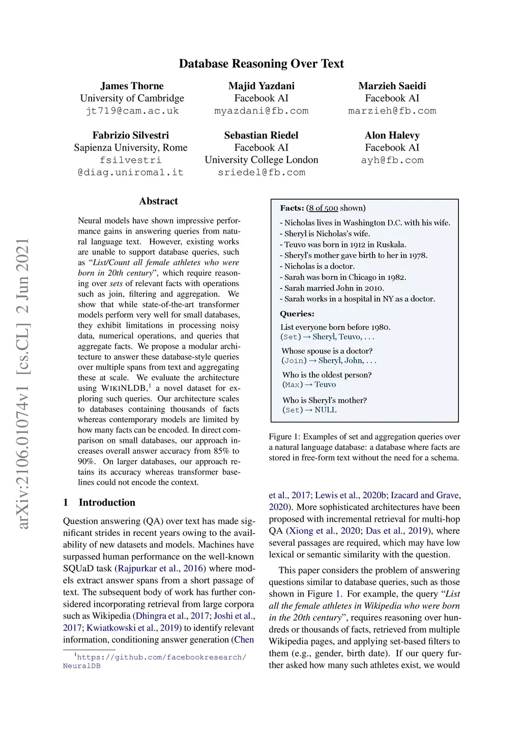 Neural models have shown impressive performance gains in answering queries from natural language text. However, existing works are unable to support database queries, such as "List/Count all female athletes who were born in 20th century", which require reasoning over sets of relevant facts with operations such as join, filtering and aggregation. We show that while state-of-the-art transformer models perform very well for small databases, they exhibit limitations in processing noisy data, numerical operations, and queries that aggregate facts. We propose a modular architecture to answer these database-style queries over multiple spans from text and aggregating these at scale. We evaluate the architecture using WikiNLDB, a novel dataset for exploring such queries. Our architecture scales to databases containing thousands of facts whereas contemporary models are limited by how many facts can be encoded. In direct comparison on small databases, our approach increases overall answer accuracy from 85% to 90%. On larger databases, our approach retains its accuracy whereas transformer baselines could not encode the context.