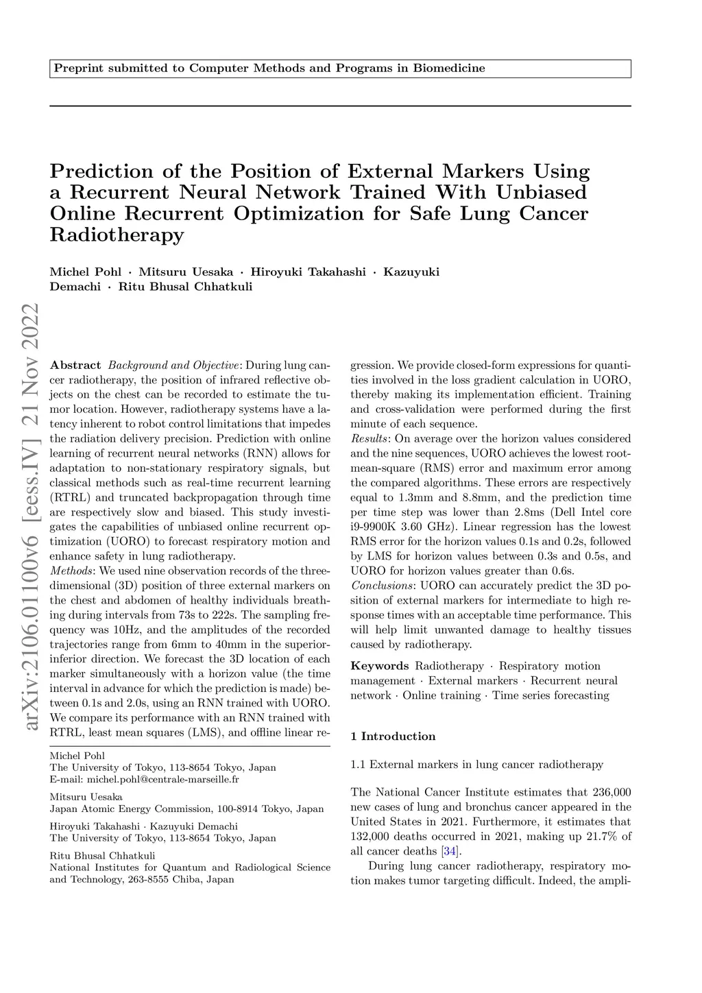 During lung radiotherapy, the position of infrared reflective objects on the chest can be recorded to estimate the tumor location. However, radiotherapy systems have a latency inherent to robot control limitations that impedes the radiation delivery precision. Prediction with online learning of recurrent neural networks (RNN) allows for adaptation to non-stationary respiratory signals, but classical methods such as RTRL and truncated BPTT are respectively slow and biased. This study investigates the capabilities of unbiased online recurrent optimization (UORO) to forecast respiratory motion and enhance safety in lung radiotherapy. We used 9 observation records of the 3D position of 3 external markers on the chest and abdomen of healthy individuals breathing during intervals from 73s to 222s. The sampling frequency was 10Hz, and the amplitudes of the recorded trajectories range from 6mm to 40mm in the superior-inferior direction. We forecast the 3D location of each marker simultaneously with a horizon value between 0.1s and 2.0s, using an RNN trained with UORO. We compare its performance with an RNN trained with RTRL, LMS, and offline linear regression. We provide closed-form expressions for quantities involved in the loss gradient calculation in UORO, thereby making its implementation efficient. Training and cross-validation were performed during the first minute of each sequence. On average over the horizon values considered and the 9 sequences, UORO achieves the lowest root-mean-square (RMS) error and maximum error among the compared algorithms. These errors are respectively equal to 1.3mm and 8.8mm, and the prediction time per time step was lower than 2.8ms (Dell Intel core i9-9900K 3.60 GHz). Linear regression has the lowest RMS error for the horizon values 0.1s and 0.2s, followed by LMS for horizon values between 0.3s and 0.5s, and UORO for horizon values greater than 0.6s.