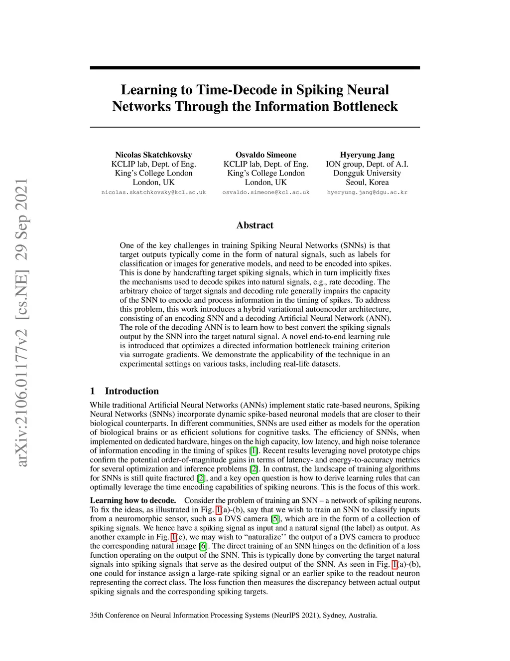 One of the key challenges in training Spiking Neural Networks (SNNs) is that target outputs typically come in the form of natural signals, such as labels for classification or images for generative models, and need to be encoded into spikes. This is done by handcrafting target spiking signals, which in turn implicitly fixes the mechanisms used to decode spikes into natural signals, e.g., rate decoding. The arbitrary choice of target signals and decoding rule generally impairs the capacity of the SNN to encode and process information in the timing of spikes. To address this problem, this work introduces a hybrid variational autoencoder architecture, consisting of an encoding SNN and a decoding Artificial Neural Network (ANN). The role of the decoding ANN is to learn how to best convert the spiking signals output by the SNN into the target natural signal. A novel end-to-end learning rule is introduced that optimizes a directed information bottleneck training criterion via surrogate gradients. We demonstrate the applicability of the technique in an experimental settings on various tasks, including real-life datasets.