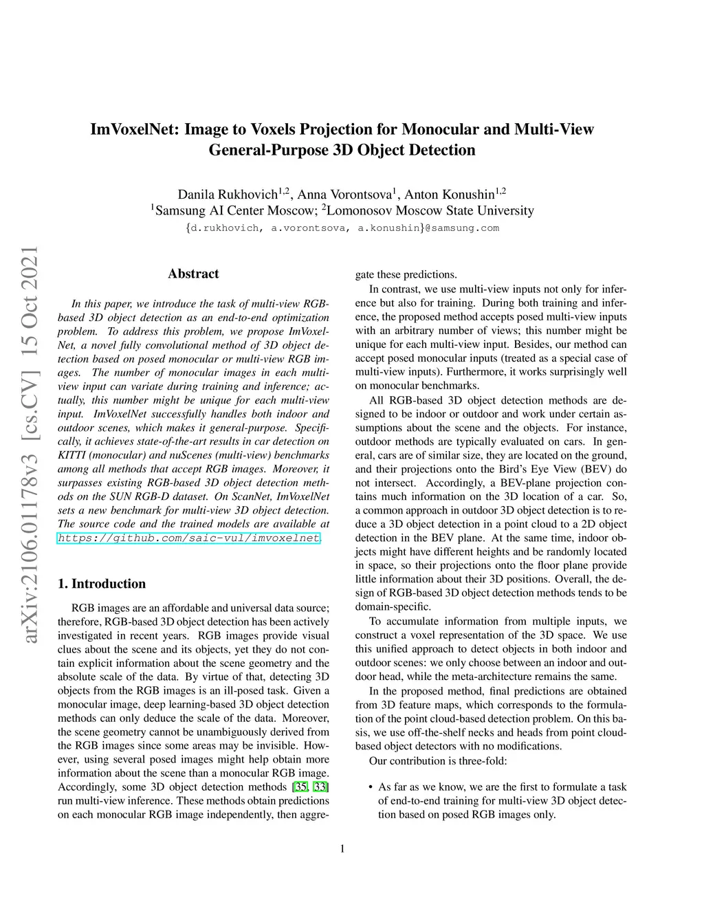ImVoxelNet: Image to Voxels Projection for Monocular and Multi-View