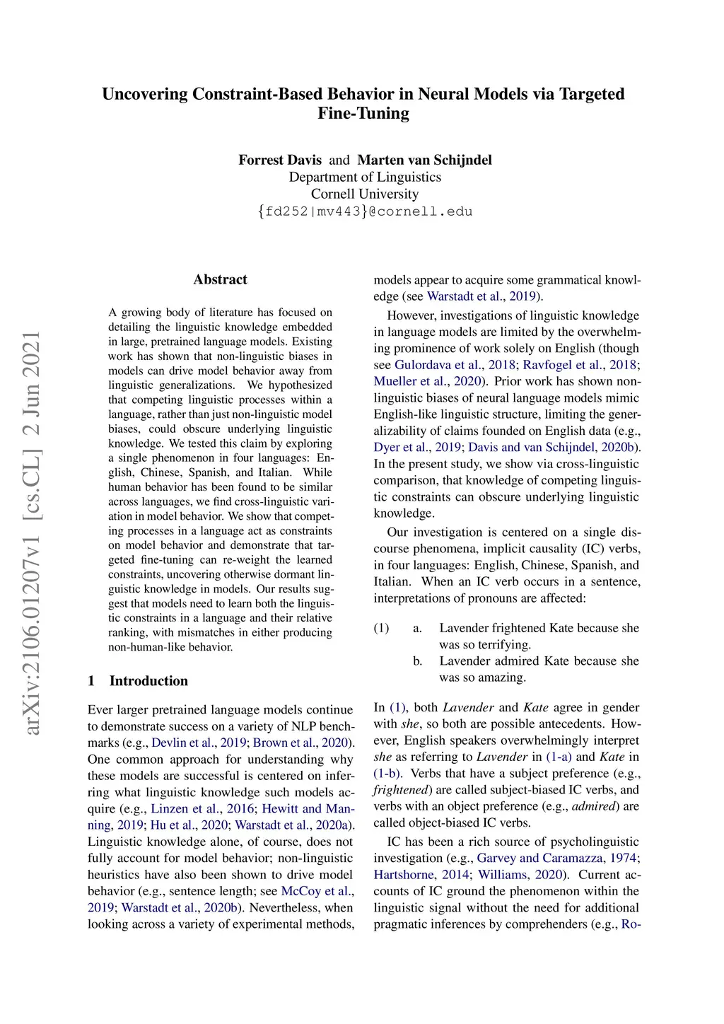 A growing body of literature has focused on detailing the linguistic knowledge embedded in large, pretrained language models. Existing work has shown that non-linguistic biases in models can drive model behavior away from linguistic generalizations. We hypothesized that competing linguistic processes within a language, rather than just non-linguistic model biases, could obscure underlying linguistic knowledge. We tested this claim by exploring a single phenomenon in four languages: English, Chinese, Spanish, and Italian. While human behavior has been found to be similar across languages, we find cross-linguistic variation in model behavior. We show that competing processes in a language act as constraints on model behavior and demonstrate that targeted fine-tuning can re-weight the learned constraints, uncovering otherwise dormant linguistic knowledge in models. Our results suggest that models need to learn both the linguistic constraints in a language and their relative ranking, with mismatches in either producing non-human-like behavior.