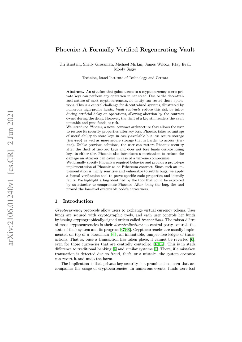 An attacker that gains access to a cryptocurrency user's private keys can perform any operation in her stead. Due to the decentralized nature of most cryptocurrencies, no entity can revert those operations. This is a central challenge for decentralized systems, illustrated by numerous high-profile heists. Vault contracts reduce this risk by introducing artificial delay on operations, allowing abortion by the contract owner during the delay. However, the theft of a key still renders the vault unusable and puts funds at risk. We introduce Phoenix, a novel contract architecture that allows the user to restore its security properties after key loss. Phoenix takes advantage of users' ability to store keys in easily-available but less secure storage (tier-two) as well as more secure storage that is harder to access (tier-one). Unlike previous solutions, the user can restore Phoenix security after the theft of tier-two keys and does not lose funds despite losing keys in either tier. Phoenix also introduces a mechanism to reduce the damage an attacker can cause in case of a tier-one compromise. We formally specify Phoenix's required behavior and provide a prototype implementation of Phoenix as an Ethereum contract. Since such an implementation is highly sensitive and vulnerable to subtle bugs, we apply a formal verification tool to prove specific code properties and identify faults. We highlight a bug identified by the tool that could be exploited by an attacker to compromise Phoenix. After fixing the bug, the tool proved the low-level executable code's correctness.