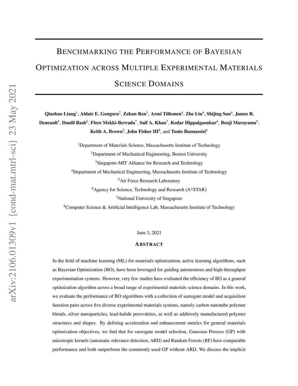 In the field of machine learning (ML) for materials optimization, active learning algorithms, such as Bayesian Optimization (BO), have been leveraged for guiding autonomous and high-throughput experimentation systems. However, very few studies have evaluated the efficiency of BO as a general optimization algorithm across a broad range of experimental materials science domains. In this work, we evaluate the performance of BO algorithms with a collection of surrogate model and acquisition function pairs across five diverse experimental materials systems, namely carbon nanotube polymer blends, silver nanoparticles, lead-halide perovskites, as well as additively manufactured polymer structures and shapes. By defining acceleration and enhancement metrics for general materials optimization objectives, we find that for surrogate model selection, Gaussian Process (GP) with anisotropic kernels (automatic relevance detection, ARD) and Random Forests (RF) have comparable performance and both outperform the commonly used GP without ARD. We discuss the implicit distributional assumptions of RF and GP, and the benefits of using GP with anisotropic kernels in detail. We provide practical insights for experimentalists on surrogate model selection of BO during materials optimization campaigns.