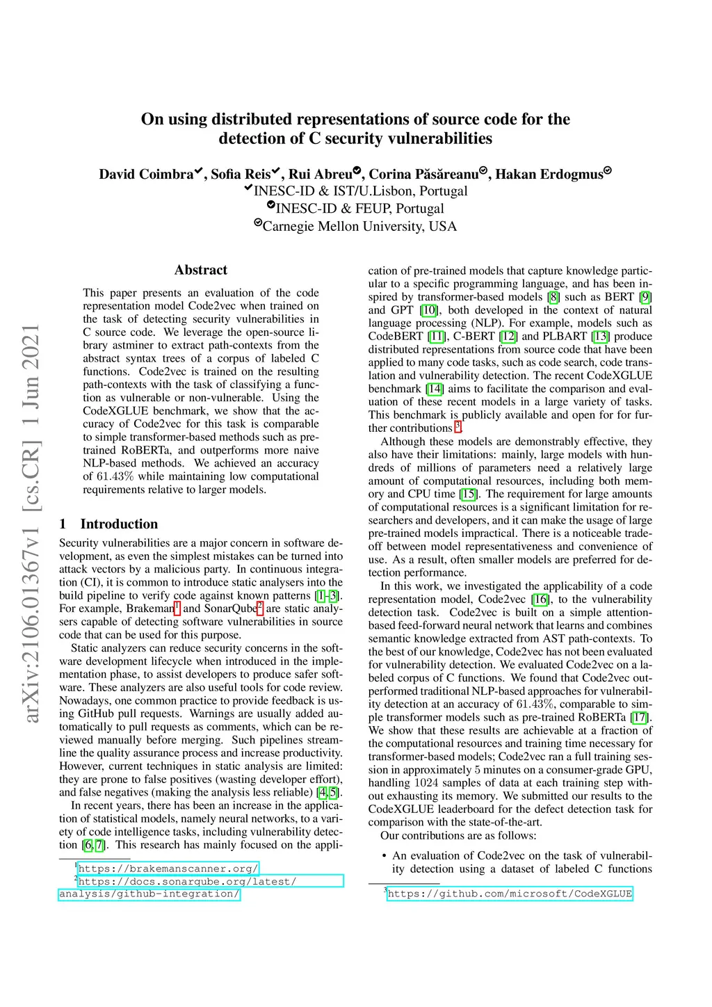 This paper presents an evaluation of the code representation model Code2vec when trained on the task of detecting security vulnerabilities in C source code. We leverage the open-source library astminer to extract path-contexts from the abstract syntax trees of a corpus of labeled C functions. Code2vec is trained on the resulting path-contexts with the task of classifying a function as vulnerable or non-vulnerable. Using the CodeXGLUE benchmark, we show that the accuracy of Code2vec for this task is comparable to simple transformer-based methods such as pre-trained RoBERTa, and outperforms more naive NLP-based methods. We achieved an accuracy of 61.43% while maintaining low computational requirements relative to larger models.