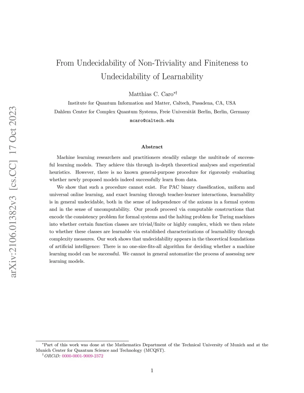 Machine learning researchers and practitioners steadily enlarge the multitude of successful learning models. They achieve this through in-depth theoretical analyses and experiential heuristics. However, there is no known general-purpose procedure for rigorously evaluating whether newly proposed models indeed successfully learn from data. We show that such a procedure cannot exist. For PAC binary classification, uniform and universal online learning, and exact learning through teacher-learner interactions, learnability is in general undecidable, both in the sense of independence of the axioms in a formal system and in the sense of uncomputability. Our proofs proceed via computable constructions that encode the consistency problem for formal systems and the halting problem for Turing machines into whether certain function classes are trivial/finite or highly complex, which we then relate to whether these classes are learnable via established characterizations of learnability through complexity measures. Our work shows that undecidability appears in the theoretical foundations of artificial intelligence: There is no one-size-fits-all algorithm for deciding whether a machine learning model can be successful. We cannot in general automatize the process of assessing new learning models.