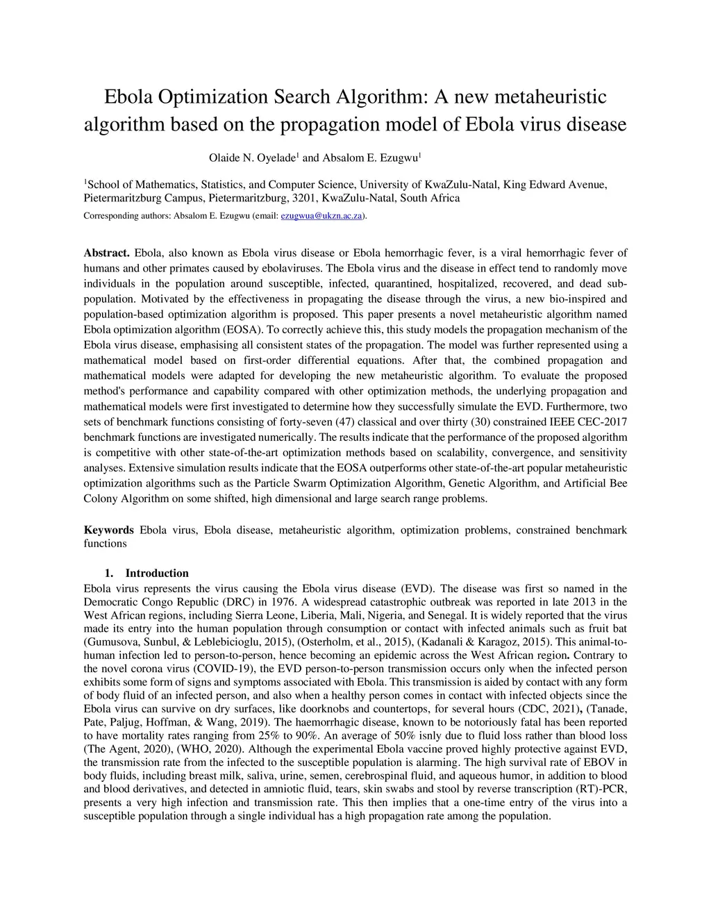 The Ebola virus and the disease in effect tend to randomly move individuals in the population around susceptible, infected, quarantined, hospitalized, recovered, and dead sub-population. Motivated by the effectiveness in propagating the disease through the virus, a new bio-inspired and population-based optimization algorithm is proposed. This paper presents a novel metaheuristic algorithm named Ebola optimization algorithm (EOSA). To correctly achieve this, this study models the propagation mechanism of the Ebola virus disease, emphasising all consistent states of the propagation. The model was further represented using a mathematical model based on first-order differential equations. After that, the combined propagation and mathematical models were adapted for developing the new metaheuristic algorithm. To evaluate the proposed method's performance and capability compared with other optimization methods, the underlying propagation and mathematical models were first investigated to determine how they successfully simulate the EVD. Furthermore, two sets of benchmark functions consisting of forty-seven (47) classical and over thirty (30) constrained IEEE CEC-2017 benchmark functions are investigated numerically. The results indicate that the performance of the proposed algorithm is competitive with other state-of-the-art optimization methods based on scalability analysis, convergence analysis, and sensitivity analysis. Extensive simulation results indicate that the EOSA outperforms other state-of-the-art popular metaheuristic optimization algorithms such as the Particle Swarm Optimization Algorithm (PSO), Genetic Algorithm (GA), and Artificial Bee Colony Algorithm (ABC) on some shifted, high dimensional and large search range problems.