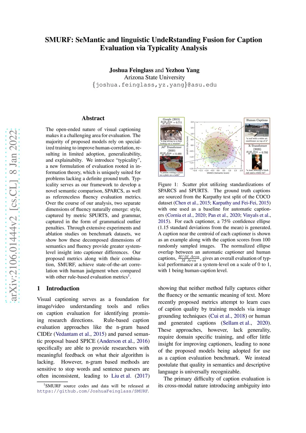 The open-ended nature of visual captioning makes it a challenging area for evaluation. The majority of proposed models rely on specialized training to improve human-correlation, resulting in limited adoption, generalizability, and explainabilty. We introduce "typicality", a new formulation of evaluation rooted in information theory, which is uniquely suited for problems lacking a definite ground truth. Typicality serves as our framework to develop a novel semantic comparison, SPARCS, as well as referenceless fluency evaluation metrics. Over the course of our analysis, two separate dimensions of fluency naturally emerge: style, captured by metric SPURTS, and grammar, captured in the form of grammatical outlier penalties. Through extensive experiments and ablation studies on benchmark datasets, we show how these decomposed dimensions of semantics and fluency provide greater system-level insight into captioner differences. Our proposed metrics along with their combination, SMURF, achieve state-of-the-art correlation with human judgment when compared with other rule-based evaluation metrics.