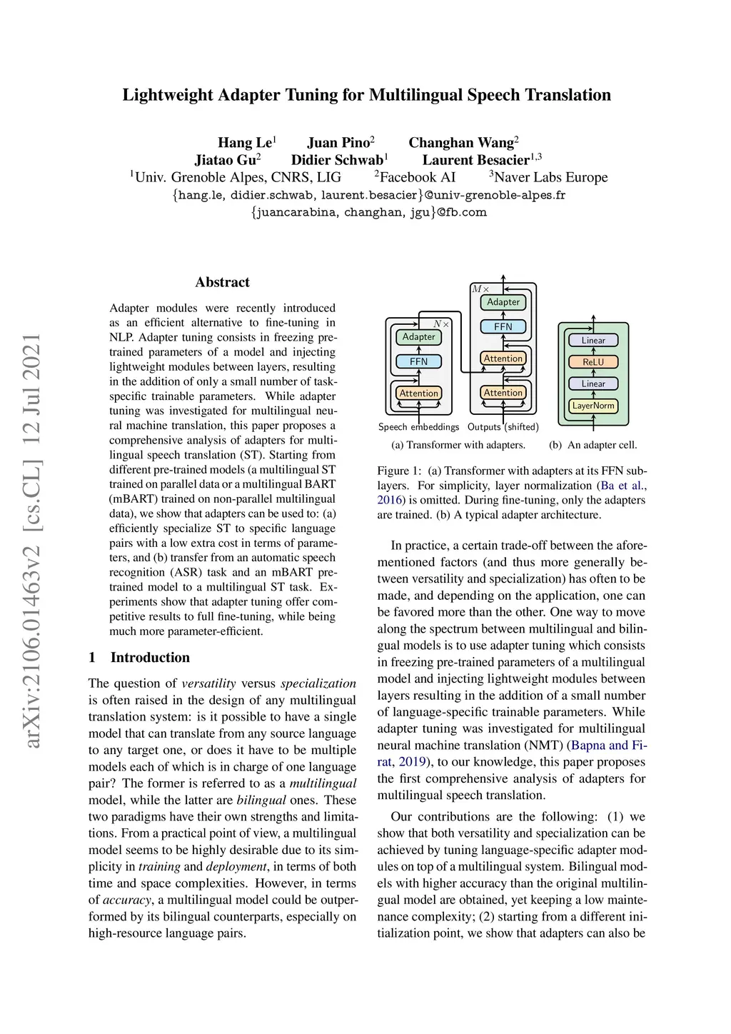 Lightweight Adapter Tuning for Multilingual Speech Translation