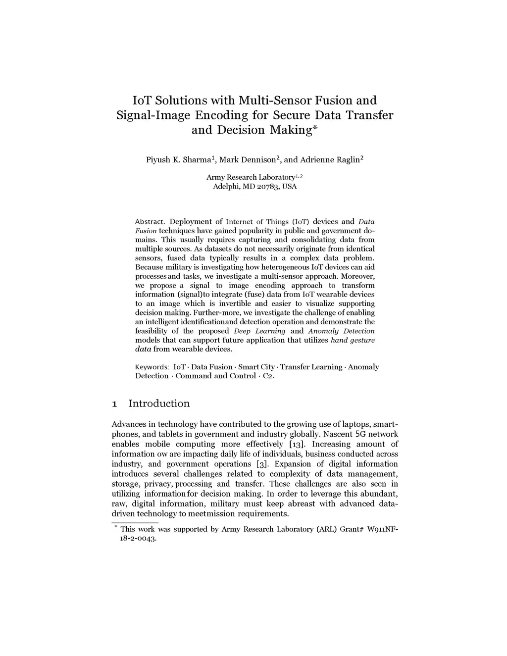 Deployment of Internet of Things (IoT) devices and Data Fusion techniques have gained popularity in public and government domains. This usually requires capturing and consolidating data from multiple sources. As datasets do not necessarily originate from identical sensors, fused data typically results in a complex data problem. Because military is investigating how heterogeneous IoT devices can aid processes and tasks, we investigate a multi-sensor approach. Moreover, we propose a signal to image encoding approach to transform information (signal) to integrate (fuse) data from IoT wearable devices to an image which is invertible and easier to visualize supporting decision making. Furthermore, we investigate the challenge of enabling an intelligent identification and detection operation and demonstrate the feasibility of the proposed Deep Learning and Anomaly Detection models that can support future application that utilizes hand gesture data from wearable devices.