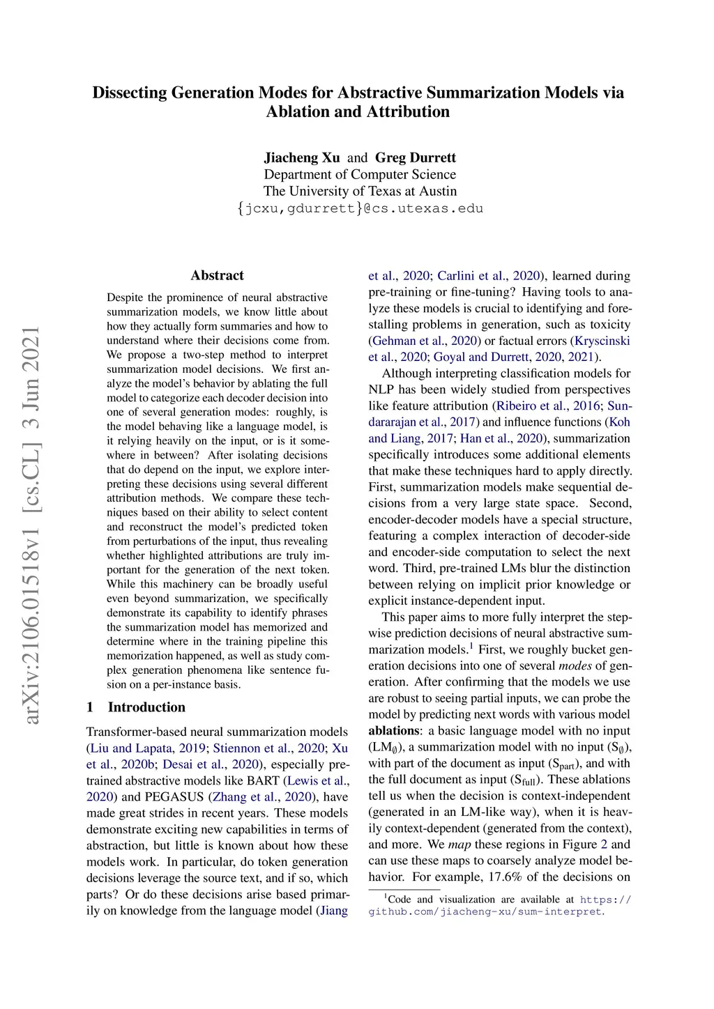 Despite the prominence of neural abstractive summarization models, we know little about how they actually form summaries and how to understand where their decisions come from. We propose a two-step method to interpret summarization model decisions. We first analyze the model's behavior by ablating the full model to categorize each decoder decision into one of several generation modes: roughly, is the model behaving like a language model, is it relying heavily on the input, or is it somewhere in between? After isolating decisions that do depend on the input, we explore interpreting these decisions using several different attribution methods. We compare these techniques based on their ability to select content and reconstruct the model's predicted token from perturbations of the input, thus revealing whether highlighted attributions are truly important for the generation of the next token. While this machinery can be broadly useful even beyond summarization, we specifically demonstrate its capability to identify phrases the summarization model has memorized and determine where in the training pipeline this memorization happened, as well as study complex generation phenomena like sentence fusion on a per-instance basis.