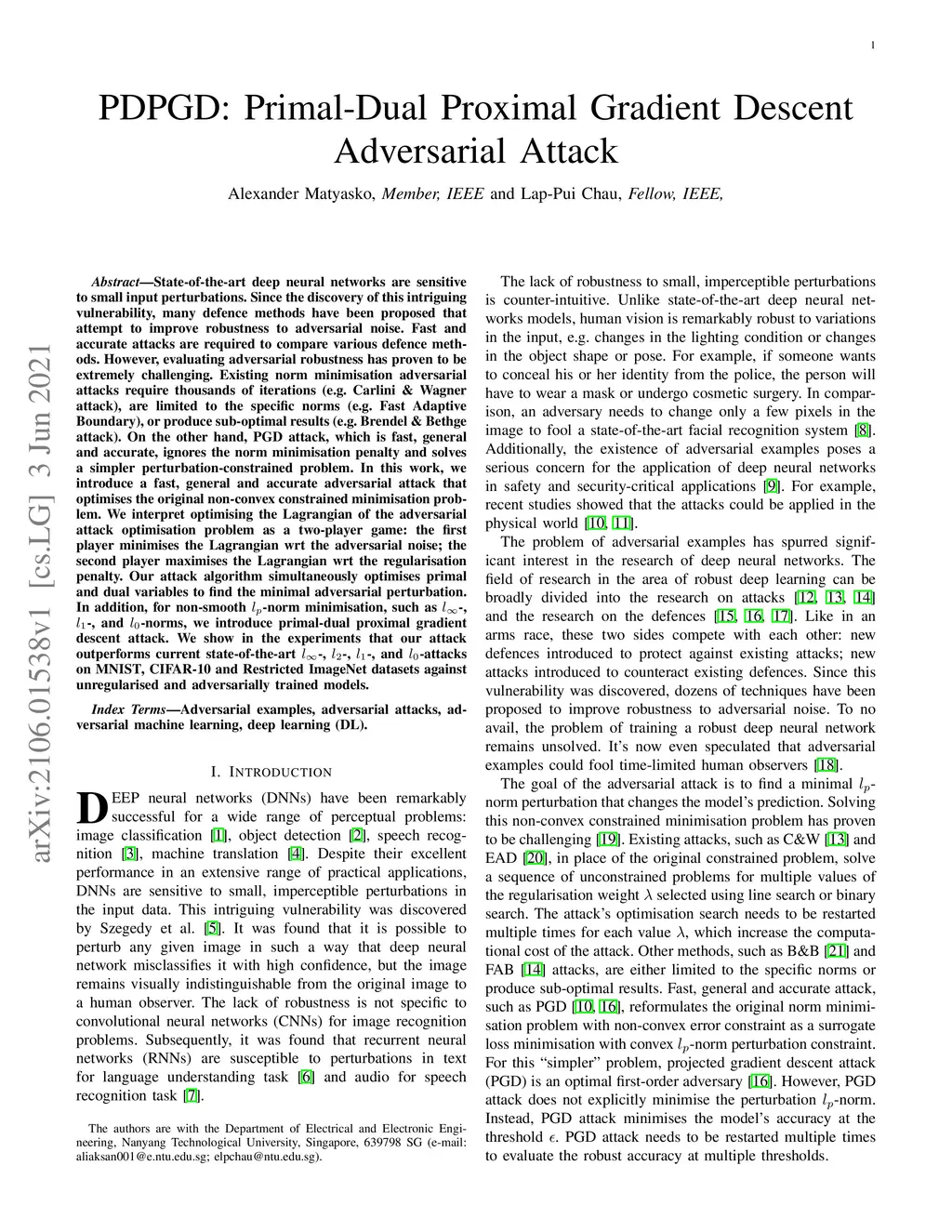 State-of-the-art deep neural networks are sensitive to small input perturbations. Since the discovery of this intriguing vulnerability, many defence methods have been proposed that attempt to improve robustness to adversarial noise. Fast and accurate attacks are required to compare various defence methods. However, evaluating adversarial robustness has proven to be extremely challenging. Existing norm minimisation adversarial attacks require thousands of iterations (e.g. Carlini & Wagner attack), are limited to the specific norms (e.g. Fast Adaptive Boundary), or produce sub-optimal results (e.g. Brendel & Bethge attack). On the other hand, PGD attack, which is fast, general and accurate, ignores the norm minimisation penalty and solves a simpler perturbation-constrained problem. In this work, we introduce a fast, general and accurate adversarial attack that optimises the original non-convex constrained minimisation problem. We interpret optimising the Lagrangian of the adversarial attack optimisation problem as a two-player game: the first player minimises the Lagrangian wrt the adversarial noise; the second player maximises the Lagrangian wrt the regularisation penalty. Our attack algorithm simultaneously optimises primal and dual variables to find the minimal adversarial perturbation. In addition, for non-smooth -norm minimisation, such as -, -, and -norms, we introduce primal-dual proximal gradient descent attack. We show in the experiments that our attack outperforms current state-of-the-art -, -, -, and -attacks on MNIST, CIFAR-10 and Restricted ImageNet datasets against unregularised and adversarially trained models.