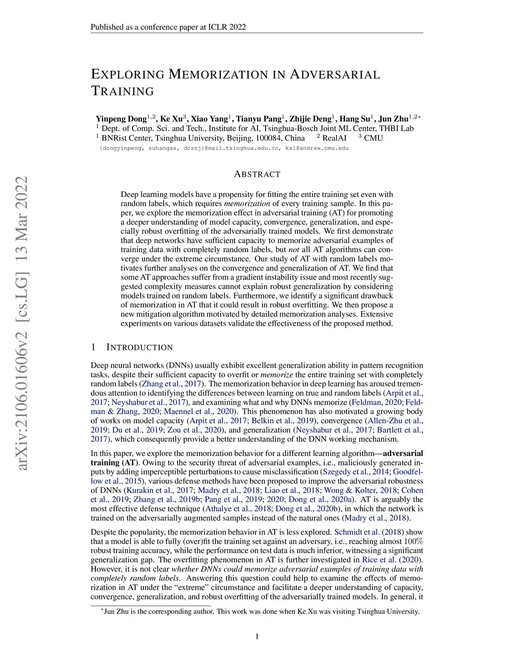 Deep learning models have a propensity for fitting the entire training set even with random labels, which requires memorization of every training sample. In this paper, we explore the memorization effect in adversarial training (AT) for promoting a deeper understanding of model capacity, convergence, generalization, and especially robust overfitting of the adversarially trained models. We first demonstrate that deep networks have sufficient capacity to memorize adversarial examples of training data with completely random labels, but not all AT algorithms can converge under the extreme circumstance. Our study of AT with random labels motivates further analyses on the convergence and generalization of AT. We find that some AT approaches suffer from a gradient instability issue and most recently suggested complexity measures cannot explain robust generalization by considering models trained on random labels. Furthermore, we identify a significant drawback of memorization in AT that it could result in robust overfitting. We then propose a new mitigation algorithm motivated by detailed memorization analyses. Extensive experiments on various datasets validate the effectiveness of the proposed method.