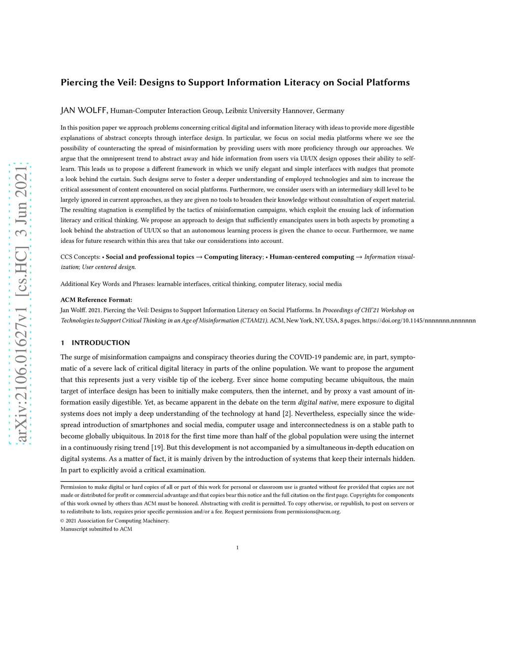 In this position paper we approach problems concerning critical digital and information literacy with ideas to provide more digestible explanations of abstract concepts through interface design. In particular, we focus on social media platforms where we see the possibility of counteracting the spread of misinformation by providing users with more proficiency through our approaches. We argue that the omnipresent trend to abstract away and hide information from users via UI/UX design opposes their ability to self-learn. This leads us to propose a different framework in which we unify elegant and simple interfaces with nudges that promote a look behind the curtain. Such designs serve to foster a deeper understanding of employed technologies and aim to increase the critical assessment of content encountered on social platforms. Furthermore, we consider users with an intermediary skill level to be largely ignored in current approaches, as they are given no tools to broaden their knowledge without consultation of expert material. The resulting stagnation is exemplified by the tactics of misinformation campaigns, which exploit the ensuing lack of information literacy and critical thinking. We propose an approach to design that sufficiently emancipates users in both aspects by promoting a look behind the abstraction of UI/UX so that an autonomous learning process is given the chance to occur. Furthermore, we name ideas for future research within this area that take our considerations into account.
