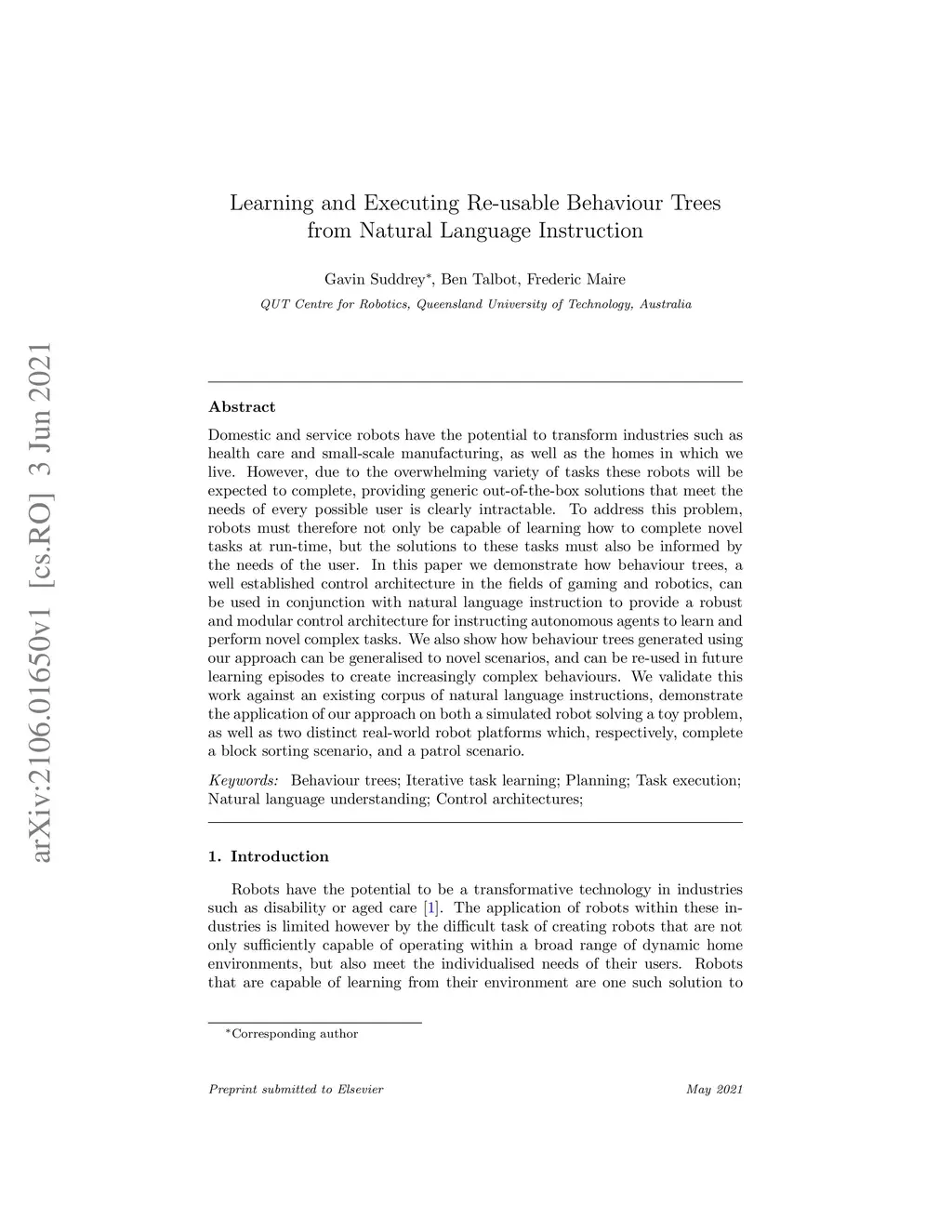 Learning and Executing Re-usable Behaviour Trees from Natural Language