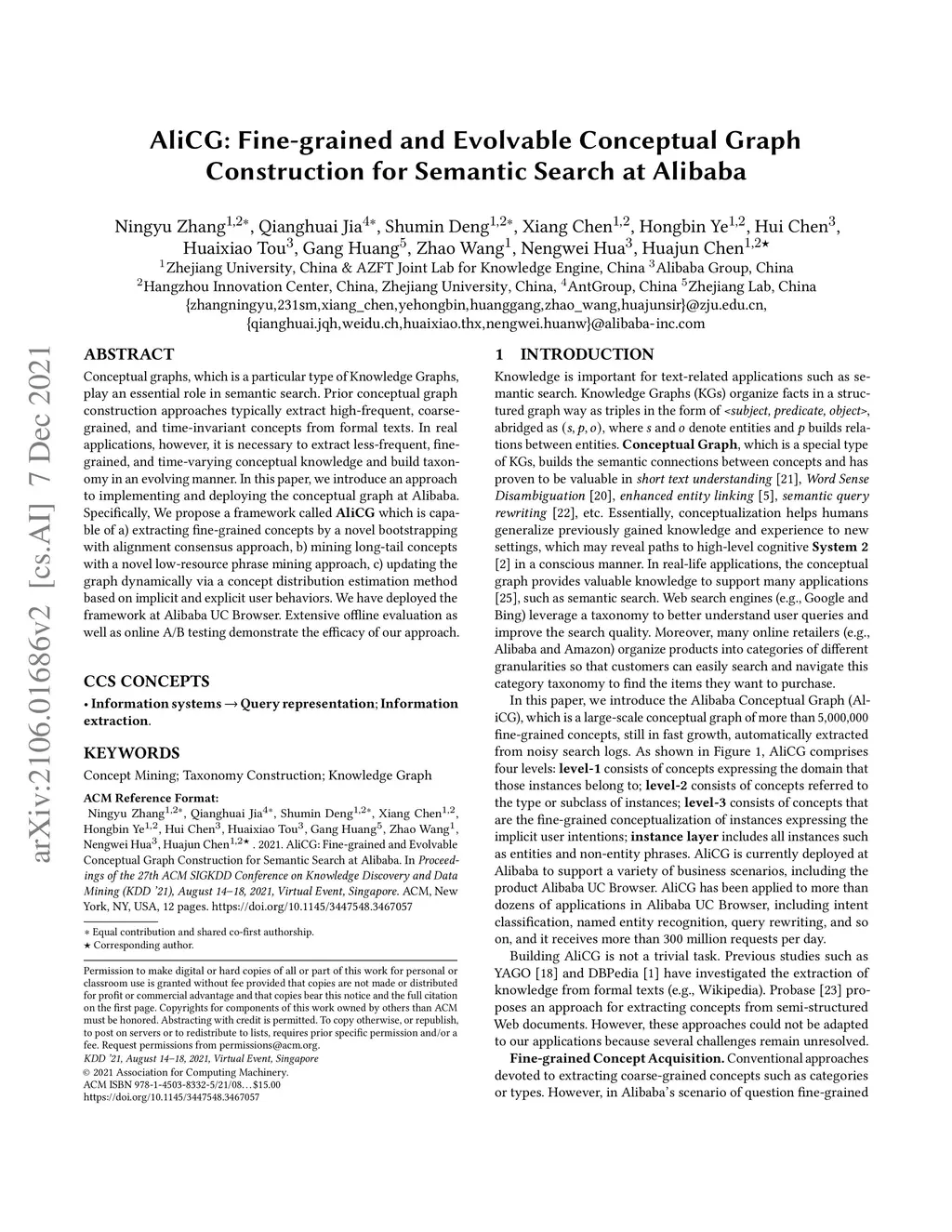 Conceptual graphs, which is a particular type of Knowledge Graphs, play an essential role in semantic search. Prior conceptual graph construction approaches typically extract high-frequent, coarse-grained, and time-invariant concepts from formal texts. In real applications, however, it is necessary to extract less-frequent, fine-grained, and time-varying conceptual knowledge and build taxonomy in an evolving manner. In this paper, we introduce an approach to implementing and deploying the conceptual graph at Alibaba. Specifically, We propose a framework called AliCG which is capable of a) extracting fine-grained concepts by a novel bootstrapping with alignment consensus approach, b) mining long-tail concepts with a novel low-resource phrase mining approach, c) updating the graph dynamically via a concept distribution estimation method based on implicit and explicit user behaviors. We have deployed the framework at Alibaba UC Browser. Extensive offline evaluation as well as online A/B testing demonstrate the efficacy of our approach.