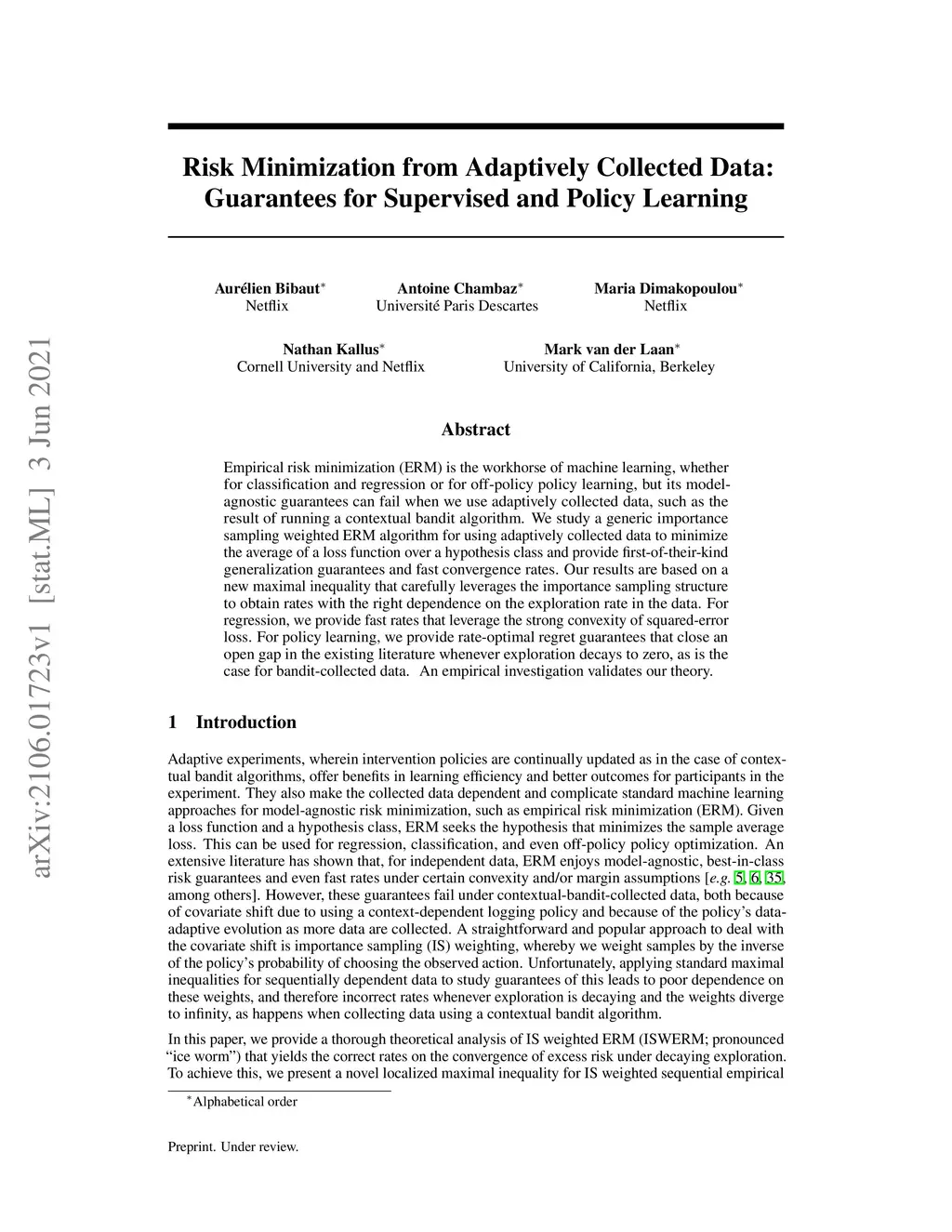 Empirical risk minimization (ERM) is the workhorse of machine learning, whether for classification and regression or for off-policy policy learning, but its model-agnostic guarantees can fail when we use adaptively collected data, such as the result of running a contextual bandit algorithm. We study a generic importance sampling weighted ERM algorithm for using adaptively collected data to minimize the average of a loss function over a hypothesis class and provide first-of-their-kind generalization guarantees and fast convergence rates. Our results are based on a new maximal inequality that carefully leverages the importance sampling structure to obtain rates with the right dependence on the exploration rate in the data. For regression, we provide fast rates that leverage the strong convexity of squared-error loss. For policy learning, we provide rate-optimal regret guarantees that close an open gap in the existing literature whenever exploration decays to zero, as is the case for bandit-collected data. An empirical investigation validates our theory.
