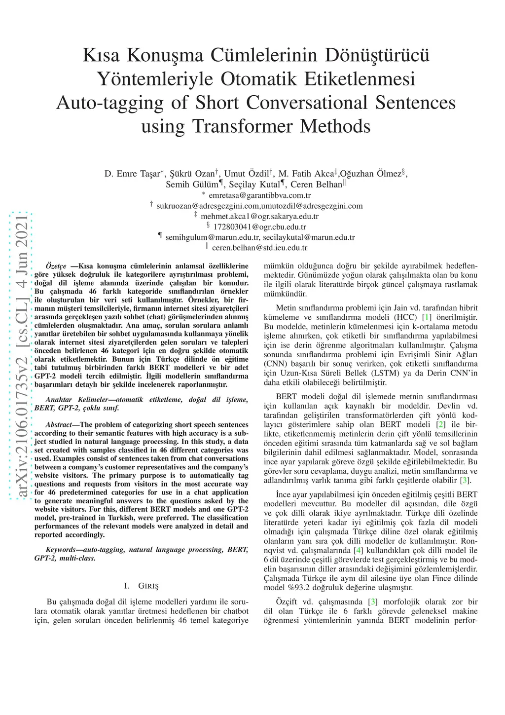 The problem of categorizing short speech sentences according to their semantic features with high accuracy is a subject studied in natural language processing. In this study, a data set created with samples classified in 46 different categories was used. Examples consist of sentences taken from chat conversations between a company's customer representatives and the company's website visitors. The primary purpose is to automatically tag questions and requests from visitors in the most accurate way for 46 predetermined categories for use in a chat application to generate meaningful answers to the questions asked by the website visitors. For this, different BERT models and one GPT-2 model, pre-trained in Turkish, were preferred. The classification performances of the relevant models were analyzed in detail and reported accordingly.