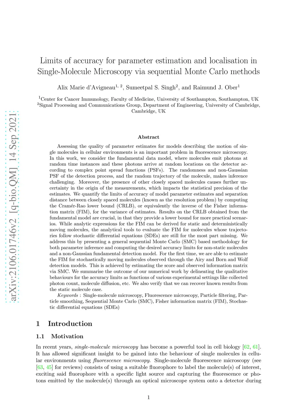 Assessing the quality of parameter estimates for models describing the motion of single molecules in cellular environments is an important problem in fluorescence microscopy. We consider the fundamental data model, where molecules emit photons at random times and the photons arrive at random locations on the detector according to complex point spread functions (PSFs). The random, non-Gaussian PSF of the detection process and random trajectory of the molecule make inference challenging. Moreover, the presence of other nearby molecules causes further uncertainty in the origin of the measurements, which impacts the statistical precision of estimates. We quantify the limits of accuracy of model parameter estimates and separation distance between closely spaced molecules (known as the resolution problem) by computing the Cramer-Rao lower bound (CRLB), or equivalently the inverse of the Fisher information matrix (FIM), for the variance of estimates. This fundamental CRLB is crucial, as it provides a lower bound for more practical scenarios. While analytic expressions for the FIM can be derived for static molecules, the analytical tools to evaluate it for molecules whose trajectories follow SDEs are still mostly missing. We address this by presenting a general SMC based methodology for both parameter inference and computing the desired accuracy limits for non-static molecules and a non-Gaussian fundamental detection model. For the first time, we are able to estimate the FIM for stochastically moving molecules observed through the Airy and Born & Wolf PSF. This is achieved by estimating the score and observed information matrix via SMC. We sum up the outcome of our numerical work by summarising the qualitative behaviours for the accuracy limits as functions of e.g. collected photon count, molecule diffusion, etc. We also verify that we can recover known results from the static molecule case.