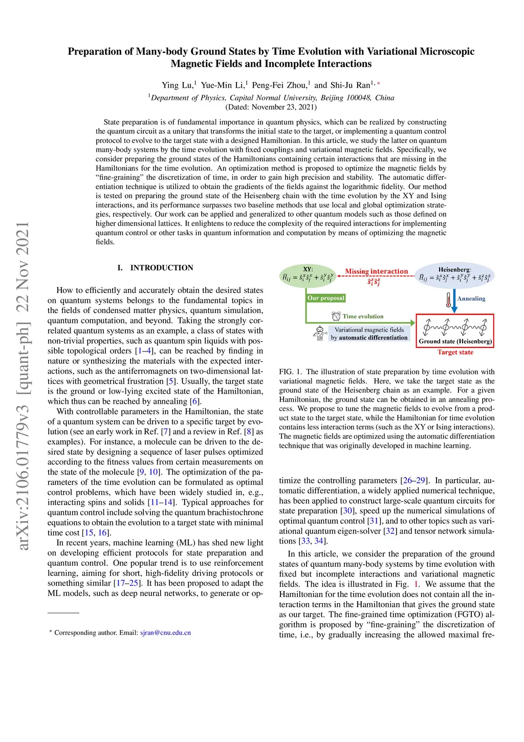 State preparation is of fundamental importance in quantum physics, which can be realized by constructing the quantum circuit as a unitary that transforms the initial state to the target, or implementing a quantum control protocol to evolve to the target state with a designed Hamiltonian. In this work, we study the latter on quantum many-body systems by the time evolution with fixed couplings and variational magnetic fields. In specific, we consider to prepare the ground states of the Hamiltonians containing certain interactions that are missing in the Hamiltonians for the time evolution. An optimization method is proposed to optimize the magnetic fields by "fine-graining" the discretization of time, in order to gain high precision and stability. The back propagation technique is utilized to obtain the gradients of the fields against the logarithmic fidelity. Our method is tested on preparing the ground state of Heisenberg chain with the time evolution by the XY and Ising interactions, and its performance surpasses two baseline methods that use local and global optimization strategies, respectively. Our work can be applied and generalized to other quantum models such as those defined on higher dimensional lattices. It enlightens to reduce the complexity of the required interactions for implementing quantum control or other tasks in quantum information and computation by means of optimizing the magnetic fields.