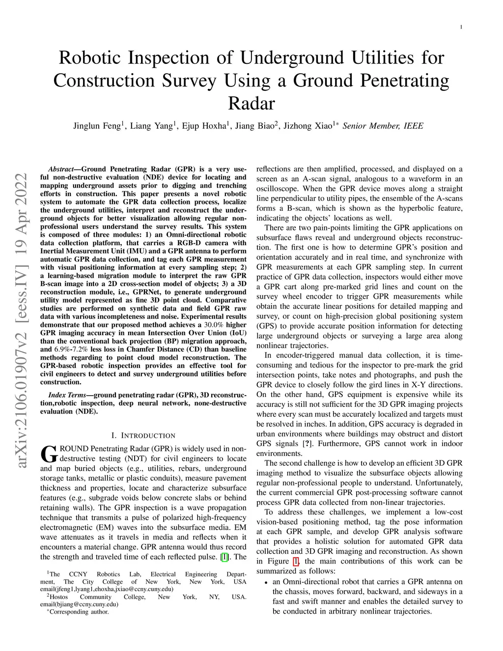 Ground Penetrating Radar (GPR) is a very useful non-destructive evaluation (NDE) device for locating and mapping underground assets prior to digging and trenching efforts in construction. This paper presents a novel robotic system to automate the GPR data collection process, localize the underground utilities, interpret and reconstruct the underground objects for better visualization allowing regular non-professional users to understand the survey results. This system is composed of three modules: 1) an Omni-directional robotic data collection platform, that carries an RGB-D camera with an Inertial Measurement Unit (IMU) and a GPR antenna to perform automatic GPR data collection, and tag each GPR measurement with visual positioning information at every sampling step; 2) a learning-based migration module to interpret the raw GPR B-scan image into a 2D cross-section model of objects; 3) a 3D reconstruction module, i.e., GPRNet, to generate underground utility model represented as fine 3D point cloud. Comparative studies are performed on synthetic data and field GPR raw data with various incompleteness and noise. Experimental results demonstrate that our proposed method achieves a higher GPR imaging accuracy in mean Intersection Over Union (IoU) than the conventional back projection (BP) migration approach and - less loss in Chamfer Distance (CD) than baseline methods regarding point cloud model reconstruction. The GPR-based robotic inspection provides an effective tool for civil engineers to detect and survey underground utilities before construction.