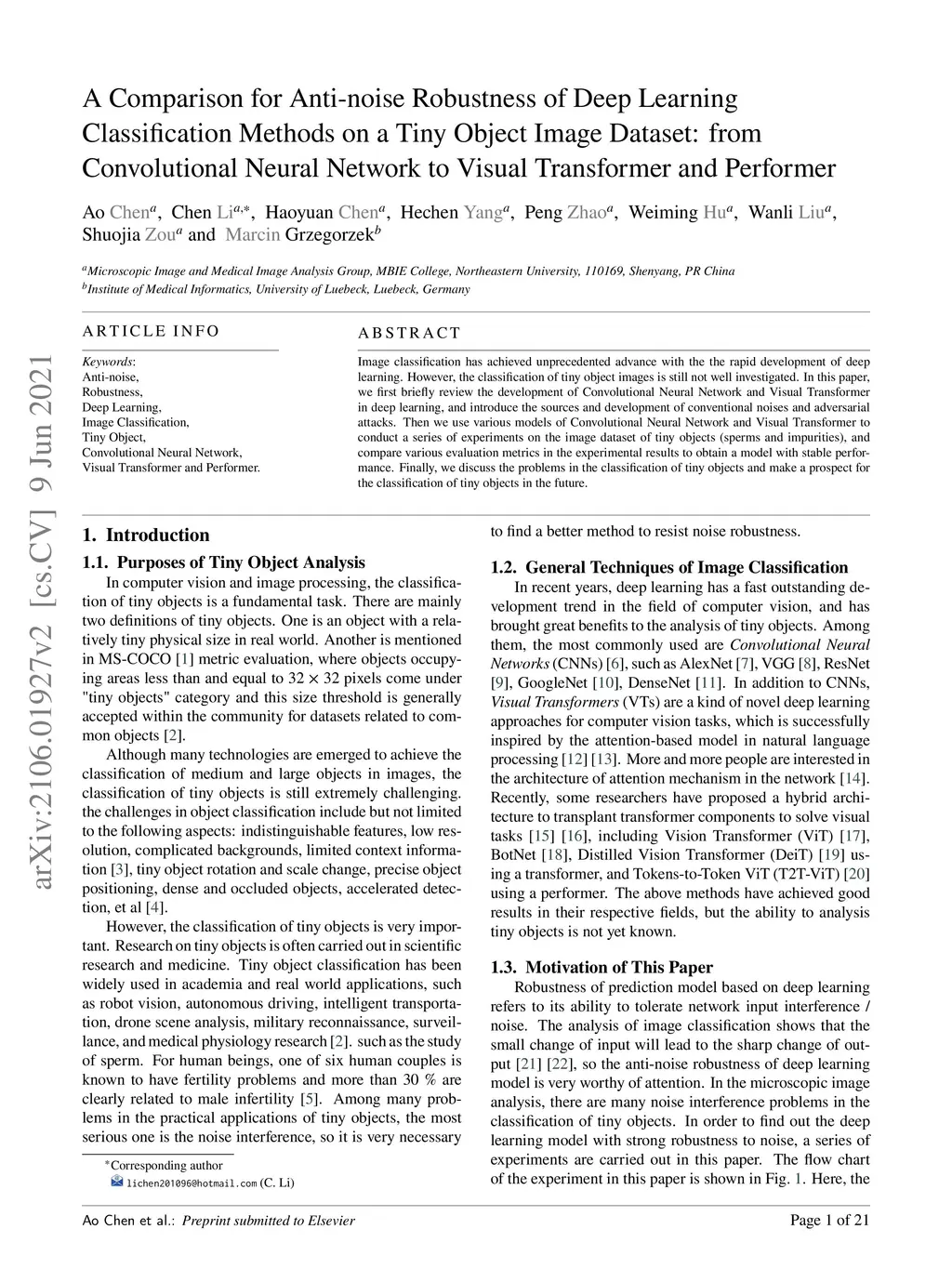 Image classification has achieved unprecedented advance with the the rapid development of deep learning. However, the classification of tiny object images is still not well investigated. In this paper, we first briefly review the development of Convolutional Neural Network and Visual Transformer in deep learning, and introduce the sources and development of conventional noises and adversarial attacks. Then we use various models of Convolutional Neural Network and Visual Transformer to conduct a series of experiments on the image dataset of tiny objects (sperms and impurities), and compare various evaluation metrics in the experimental results to obtain a model with stable performance. Finally, we discuss the problems in the classification of tiny objects and make a prospect for the classification of tiny objects in the future.