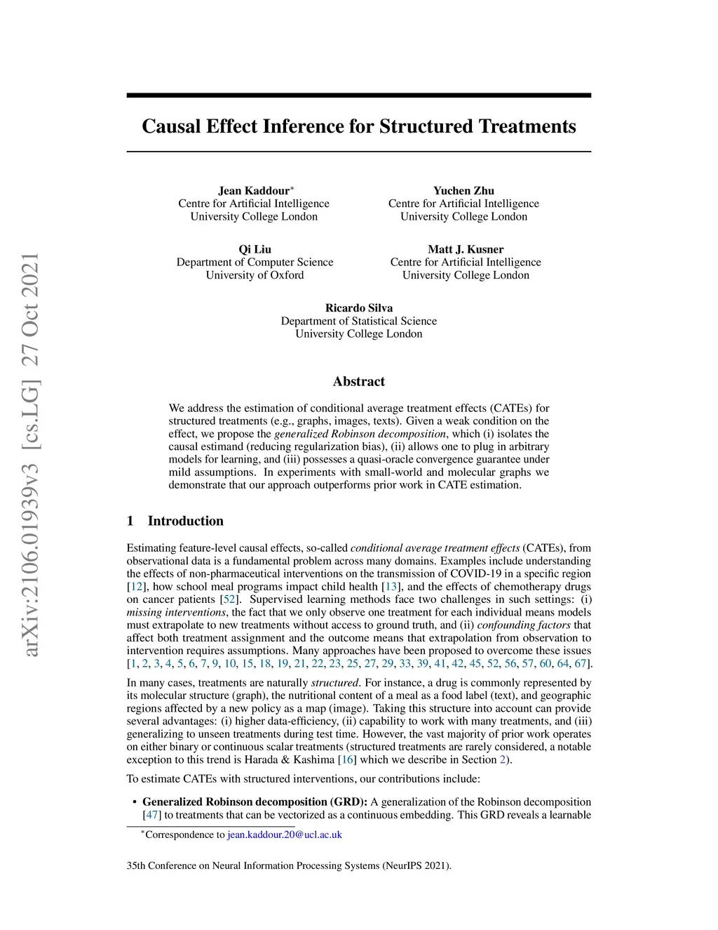 We address the estimation of conditional average treatment effects (CATEs) for structured treatments (e.g., graphs, images, texts). Given a weak condition on the effect, we propose the generalized Robinson decomposition, which (i) isolates the causal estimand (reducing regularization bias), (ii) allows one to plug in arbitrary models for learning, and (iii) possesses a quasi-oracle convergence guarantee under mild assumptions. In experiments with small-world and molecular graphs we demonstrate that our approach outperforms prior work in CATE estimation.