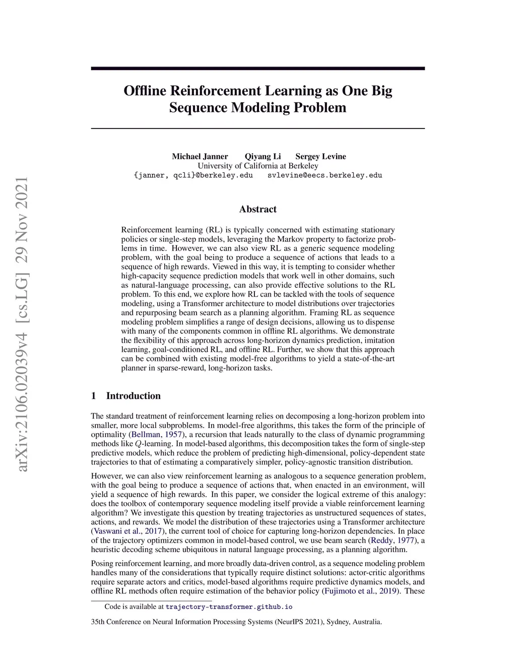 Reinforcement learning (RL) is typically concerned with estimating stationary policies or single-step models, leveraging the Markov property to factorize problems in time. However, we can also view RL as a generic sequence modeling problem, with the goal being to produce a sequence of actions that leads to a sequence of high rewards. Viewed in this way, it is tempting to consider whether high-capacity sequence prediction models that work well in other domains, such as natural-language processing, can also provide effective solutions to the RL problem. To this end, we explore how RL can be tackled with the tools of sequence modeling, using a Transformer architecture to model distributions over trajectories and repurposing beam search as a planning algorithm. Framing RL as sequence modeling problem simplifies a range of design decisions, allowing us to dispense with many of the components common in offline RL algorithms. We demonstrate the flexibility of this approach across long-horizon dynamics prediction, imitation learning, goal-conditioned RL, and offline RL. Further, we show that this approach can be combined with existing model-free algorithms to yield a state-of-the-art planner in sparse-reward, long-horizon tasks.