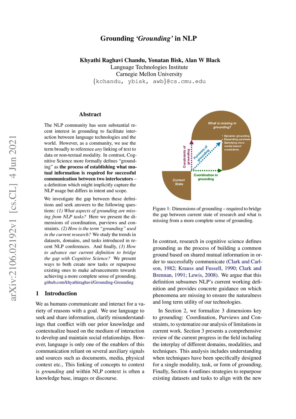 The NLP community has seen substantial recent interest in grounding to facilitate interaction between language technologies and the world. However, as a community, we use the term broadly to reference any linking of text to data or non-textual modality. In contrast, Cognitive Science more formally defines "grounding" as the process of establishing what mutual information is required for successful communication between two interlocutors -- a definition which might implicitly capture the NLP usage but differs in intent and scope. We investigate the gap between these definitions and seek answers to the following questions: (1) What aspects of grounding are missing from NLP tasks? Here we present the dimensions of coordination, purviews and constraints. (2) How is the term "grounding" used in the current research? We study the trends in datasets, domains, and tasks introduced in recent NLP conferences. And finally, (3) How to advance our current definition to bridge the gap with Cognitive Science? We present ways to both create new tasks or repurpose existing ones to make advancements towards achieving a more complete sense of grounding.