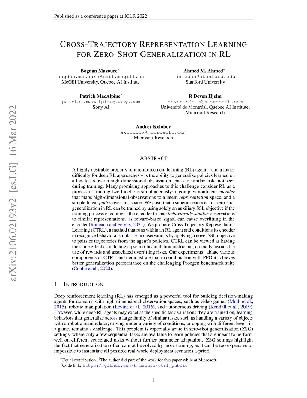 Cross-Trajectory Representation Learning for Zero-Shot Generalization in