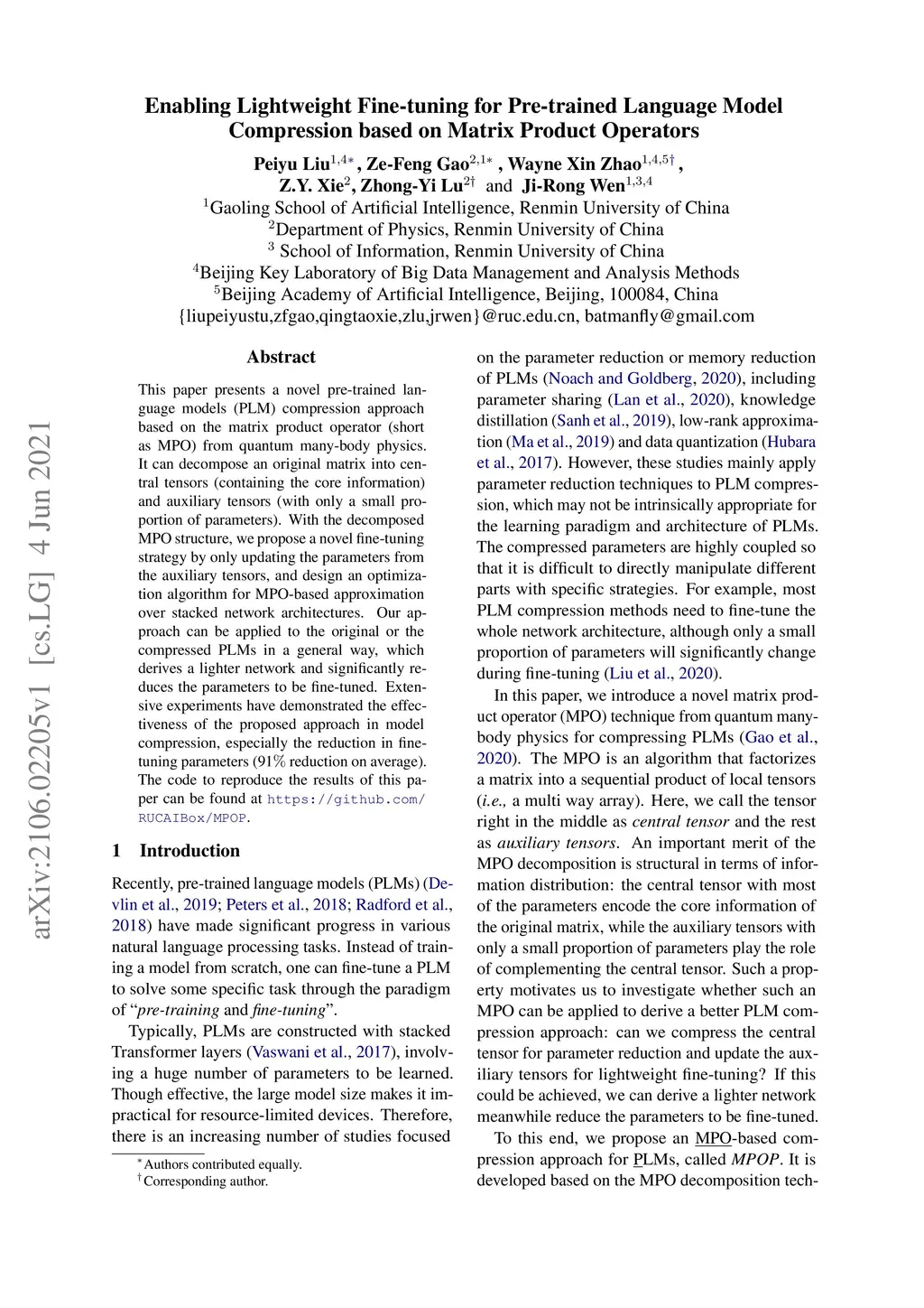This paper presents a novel pre-trained language models (PLM) compression approach based on the matrix product operator (short as MPO) from quantum many-body physics. It can decompose an original matrix into central tensors (containing the core information) and auxiliary tensors (with only a small proportion of parameters). With the decomposed MPO structure, we propose a novel fine-tuning strategy by only updating the parameters from the auxiliary tensors, and design an optimization algorithm for MPO-based approximation over stacked network architectures. Our approach can be applied to the original or the compressed PLMs in a general way, which derives a lighter network and significantly reduces the parameters to be fine-tuned. Extensive experiments have demonstrated the effectiveness of the proposed approach in model compression, especially the reduction in finetuning parameters (91% reduction on average).