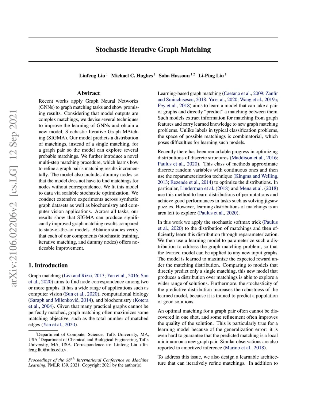 Recent works leveraging Graph Neural Networks to approach graph matching tasks have shown promising results. Recent progress in learning discrete distributions poses new opportunities for learning graph matching models. In this work, we propose a new model, Stochastic Iterative Graph MAtching (SIGMA), to address the graph matching problem. Our model defines a distribution of matchings for a graph pair so the model can explore a wide range of possible matchings. We further introduce a novel multi-step matching procedure, which learns how to refine a graph pair's matching results incrementally. The model also includes dummy nodes so that the model does not have to find matchings for nodes without correspondence. We fit this model to data via scalable stochastic optimization. We conduct extensive experiments across synthetic graph datasets as well as biochemistry and computer vision applications. Across all tasks, our results show that SIGMA can produce significantly improved graph matching results compared to state-of-the-art models. Ablation studies verify that each of our components (stochastic training, iterative matching, and dummy nodes) offers noticeable improvement.