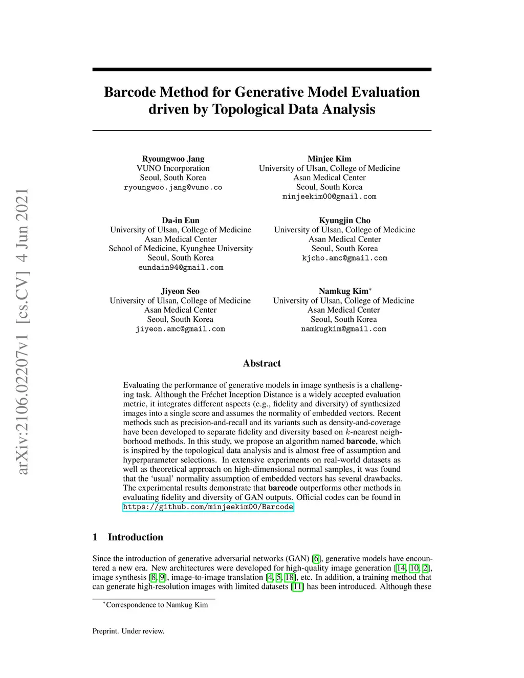 Evaluating the performance of generative models in image synthesis is a challenging task. Although the Fr\échet Inception Distance is a widely accepted evaluation metric, it integrates different aspects (e.g., fidelity and diversity) of synthesized images into a single score and assumes the normality of embedded vectors. Recent methods such as precision-and-recall and its variants such as density-and-coverage have been developed to separate fidelity and diversity based on k-nearest neighborhood methods. In this study, we propose an algorithm named barcode, which is inspired by the topological data analysis and is almost free of assumption and hyperparameter selections. In extensive experiments on real-world datasets as well as theoretical approach on high-dimensional normal samples, it was found that the úsual' normality assumption of embedded vectors has several drawbacks. The experimental results demonstrate that barcode outperforms other methods in evaluating fidelity and diversity of GAN outputs. Official codes can be found in https://github.com/minjeekim00/Barcode.