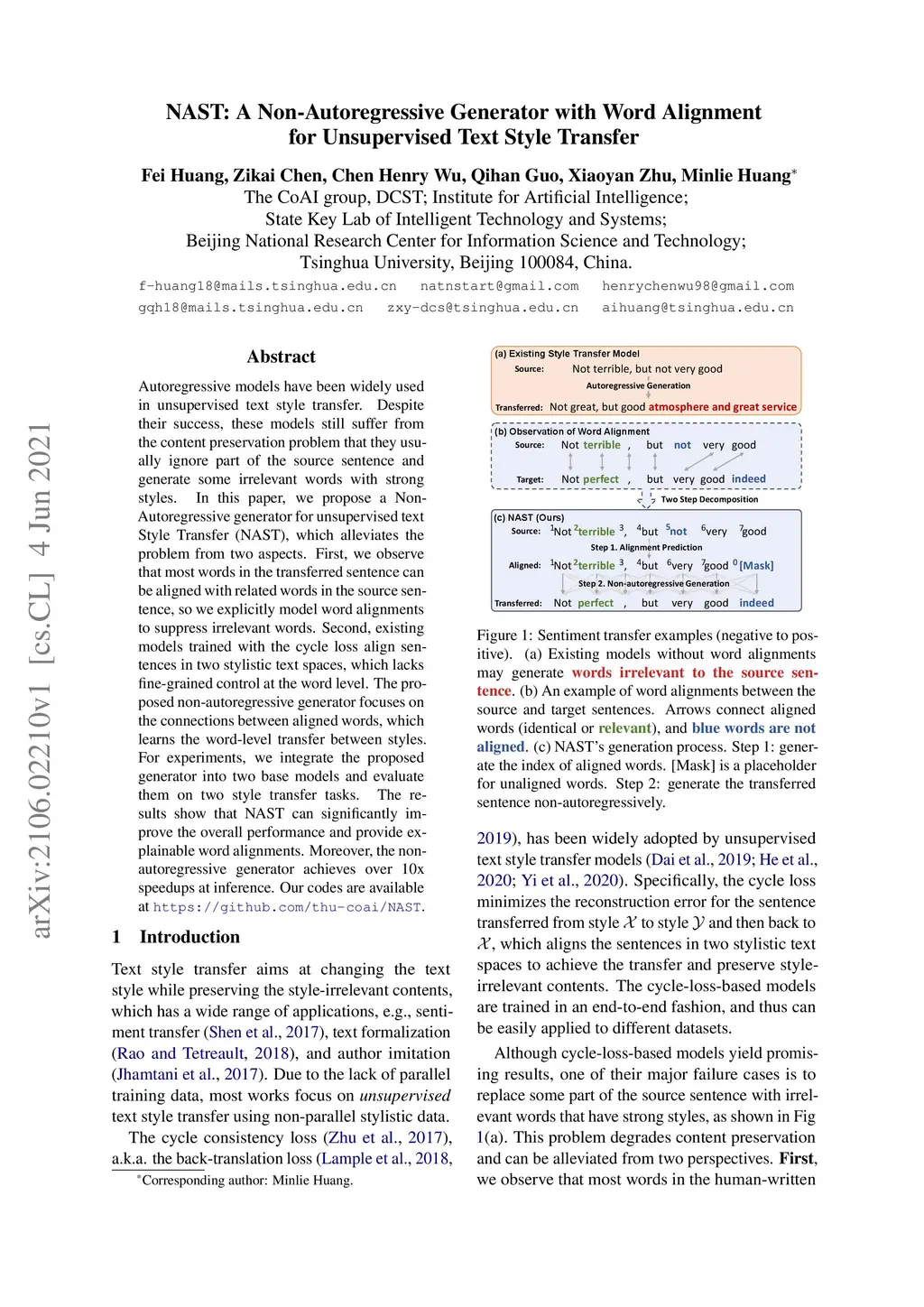 Autoregressive models have been widely used in unsupervised text style transfer. Despite their success, these models still suffer from the content preservation problem that they usually ignore part of the source sentence and generate some irrelevant words with strong styles. In this paper, we propose a Non-Autoregressive generator for unsupervised text Style Transfer (NAST), which alleviates the problem from two aspects. First, we observe that most words in the transferred sentence can be aligned with related words in the source sentence, so we explicitly model word alignments to suppress irrelevant words. Second, existing models trained with the cycle loss align sentences in two stylistic text spaces, which lacks fine-grained control at the word level. The proposed non-autoregressive generator focuses on the connections between aligned words, which learns the word-level transfer between styles. For experiments, we integrate the proposed generator into two base models and evaluate them on two style transfer tasks. The results show that NAST can significantly improve the overall performance and provide explainable word alignments. Moreover, the non-autoregressive generator achieves over 10x speedups at inference. Our codes are available at https://github.com/thu-coai/NAST.