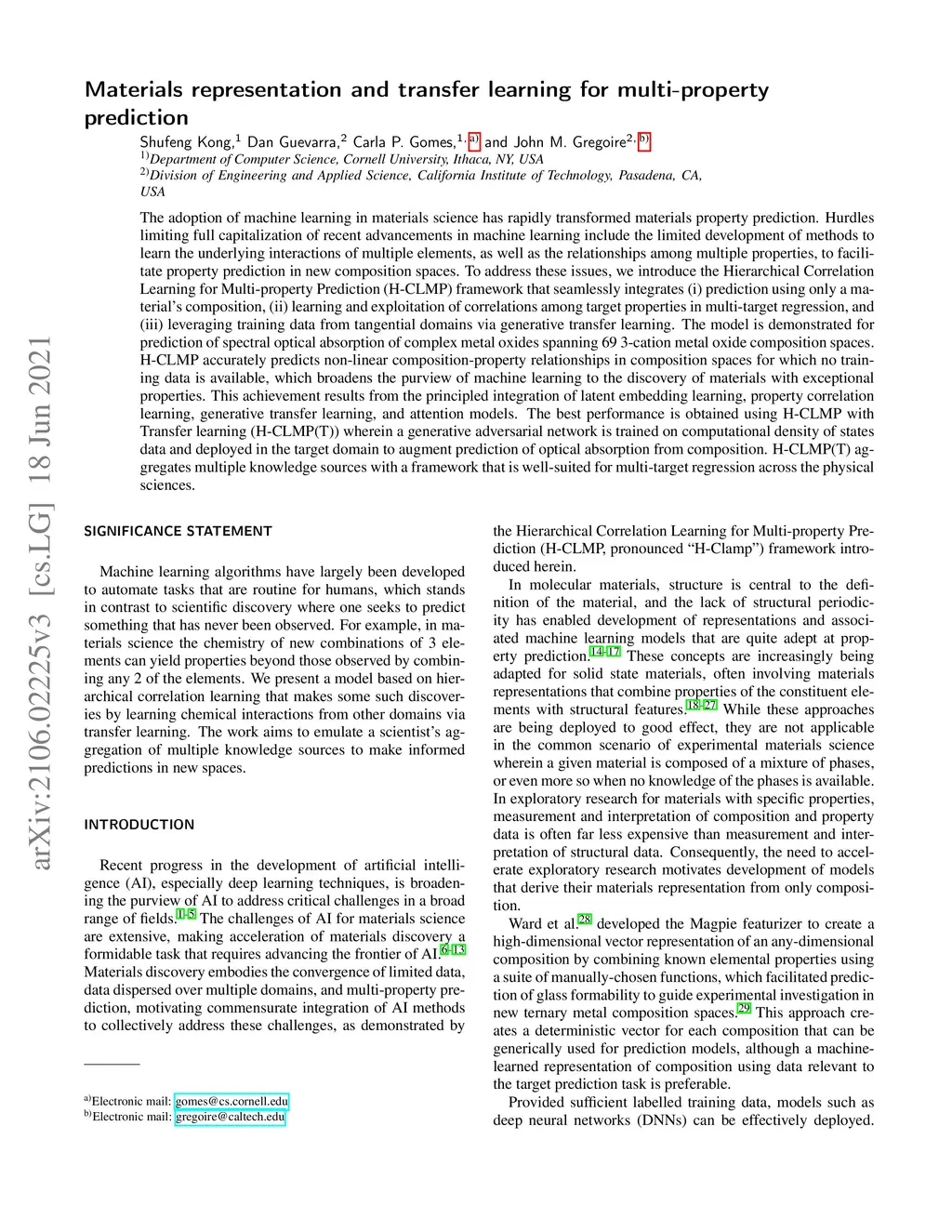The adoption of machine learning in materials science has rapidly transformed materials property prediction. Hurdles limiting full capitalization of recent advancements in machine learning include the limited development of methods to learn the underlying interactions of multiple elements, as well as the relationships among multiple properties, to facilitate property prediction in new composition spaces. To address these issues, we introduce the Hierarchical Correlation Learning for Multi-property Prediction (H-CLMP) framework that seamlessly integrates (i) prediction using only a material's composition, (ii) learning and exploitation of correlations among target properties in multi-target regression, and (iii) leveraging training data from tangential domains via generative transfer learning. The model is demonstrated for prediction of spectral optical absorption of complex metal oxides spanning 69 3-cation metal oxide composition spaces. H-CLMP accurately predicts non-linear composition-property relationships in composition spaces for which no training data is available, which broadens the purview of machine learning to the discovery of materials with exceptional properties. This achievement results from the principled integration of latent embedding learning, property correlation learning, generative transfer learning, and attention models. The best performance is obtained using H-CLMP with Transfer learning (H-CLMP(T)) wherein a generative adversarial network is trained on computational density of states data and deployed in the target domain to augment prediction of optical absorption from composition. H-CLMP(T) aggregates multiple knowledge sources with a framework that is well-suited for multi-target regression across the physical sciences.