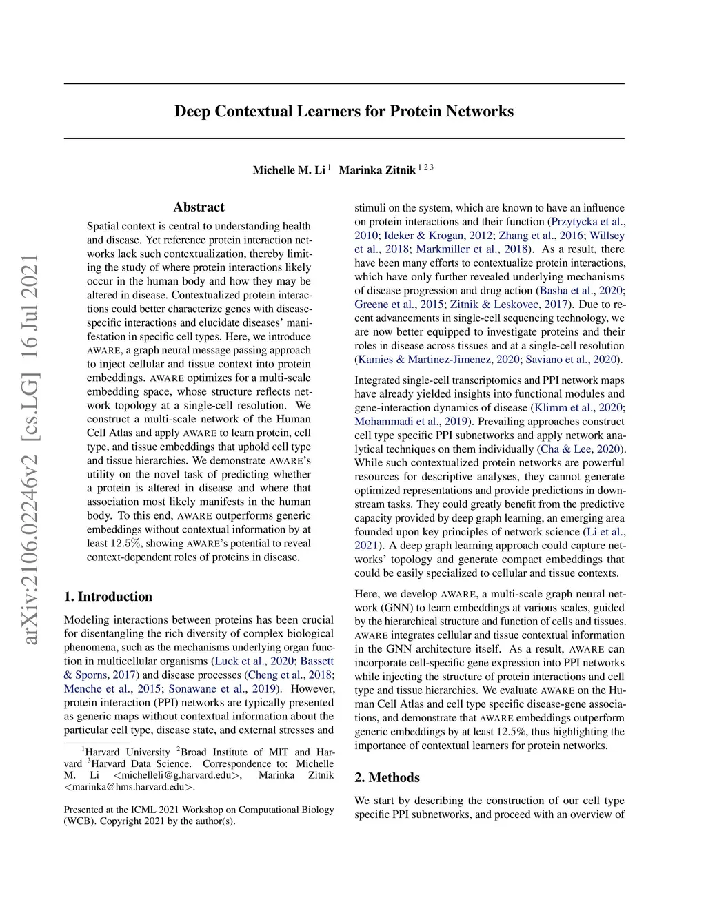 Spatial context is central to understanding health and disease. Yet reference protein interaction networks lack such contextualization, thereby limiting the study of where protein interactions likely occur in the human body and how they may be altered in disease. Contextualized protein interactions could better characterize genes with disease-specific interactions and elucidate diseases' manifestation in specific cell types. Here, we introduce AWARE, a graph neural message passing approach to inject cellular and tissue context into protein embeddings. AWARE optimizes for a multi-scale embedding space, whose structure reflects network topology at a single-cell resolution. We construct a multi-scale network of the Human Cell Atlas and apply AWARE to learn protein, cell type, and tissue embeddings that uphold cell type and tissue hierarchies. We demonstrate AWARE's utility on the novel task of predicting whether a protein is altered in disease and where that association most likely manifests in the human body. To this end, AWARE outperforms generic embeddings without contextual information by at least 12.5%, showing AWARE's potential to reveal context-dependent roles of proteins in disease.