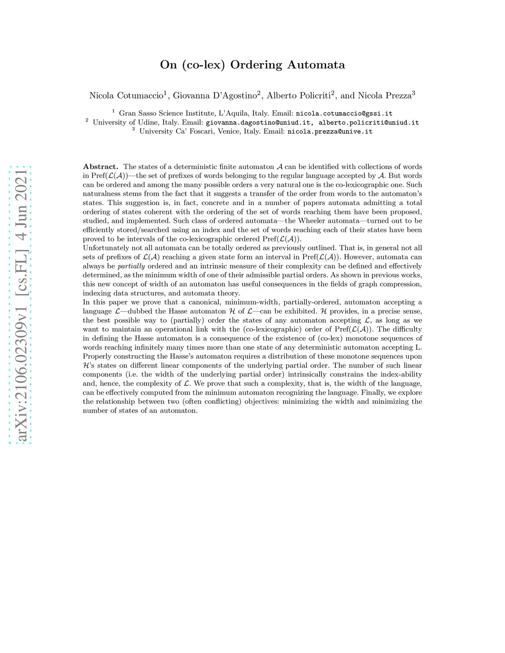 The states of a deterministic finite automaton A can be identified with collections of words in Pf(L(A)) -- the set of prefixes of words belonging to the regular language accepted by A. But words can be ordered and among the many possible orders a very natural one is the co-lexicographic one. Such naturalness stems from the fact that it suggests a transfer of the order from words to the automaton's states. In a number of papers automata admitting a total ordering of states coherent with the ordering of the set of words reaching them have been proposed. Such class of ordered automata -- the Wheeler automata -- turned out to be efficiently stored/searched using an index. Unfortunately not all automata can be totally ordered as previously outlined. However, automata can always be partially ordered and an intrinsic measure of their complexity can be defined and effectively determined, as the minimum width of one of their admissible partial orders. As shown in previous works, this new concept of width of an automaton has useful consequences in the fields of graph compression, indexing data structures, and automata theory. In this paper we prove that a canonical, minimum-width, partially-ordered automaton accepting a language L -- dubbed the Hasse automaton H of L -- can be exhibited. H provides, in a precise sense, the best possible way to (partially) order the states of any automaton accepting L, as long as we want to maintain an operational link with the (co-lexicographic) order of Pf(L(A)). Using H we prove that the width of the language can be effectively computed from the minimum automaton recognizing the language. Finally, we explore the relationship between two (often conflicting) objectives: minimizing the width and minimizing the number of states of an automaton.