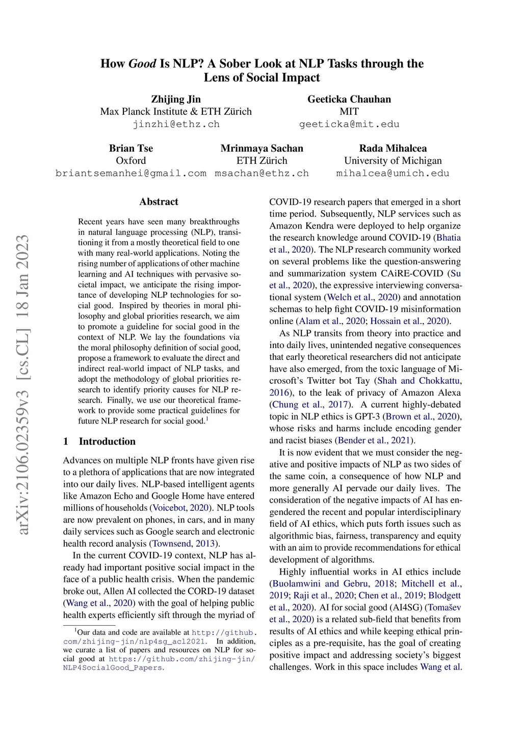 Recent years have seen many breakthroughs in natural language processing (NLP), transitioning it from a mostly theoretical field to one with many real-world applications. Noting the rising number of applications of other machine learning and AI techniques with pervasive societal impact, we anticipate the rising importance of developing NLP technologies for social good. Inspired by theories in moral philosophy and global priorities research, we aim to promote a guideline for social good in the context of NLP. We lay the foundations via the moral philosophy definition of social good, propose a framework to evaluate the direct and indirect real-world impact of NLP tasks, and adopt the methodology of global priorities research to identify priority causes for NLP research. Finally, we use our theoretical framework to provide some practical guidelines for future NLP research for social good. Our data and code are available at http://github.com/zhijing-jin/nlp4sg_acl2021. In addition, we curate a list of papers and resources on NLP for social good at https://github.com/zhijing-jin/NLP4SocialGood_Papers.