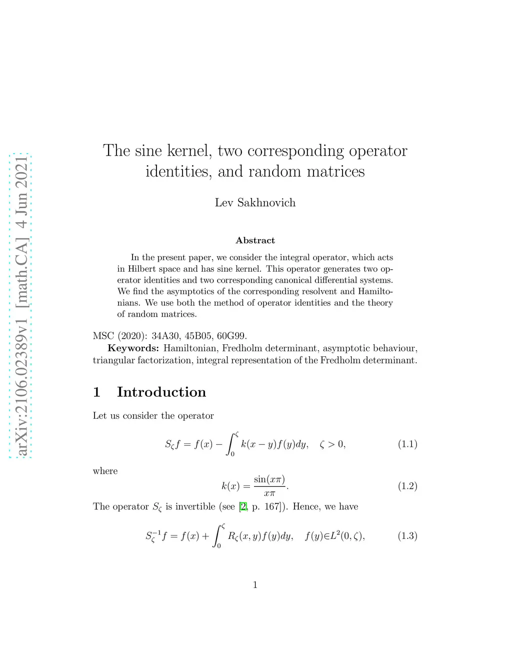 In the present paper, we consider the integral operator, which acts in Hilbert space and has sine kernel. This operator generates two operator identities and two corresponding canonical differential systems. We find the asymptotics of the corresponding resolvent and Hamiltonians. We use both the method of operator identities and the theory of random matrices.