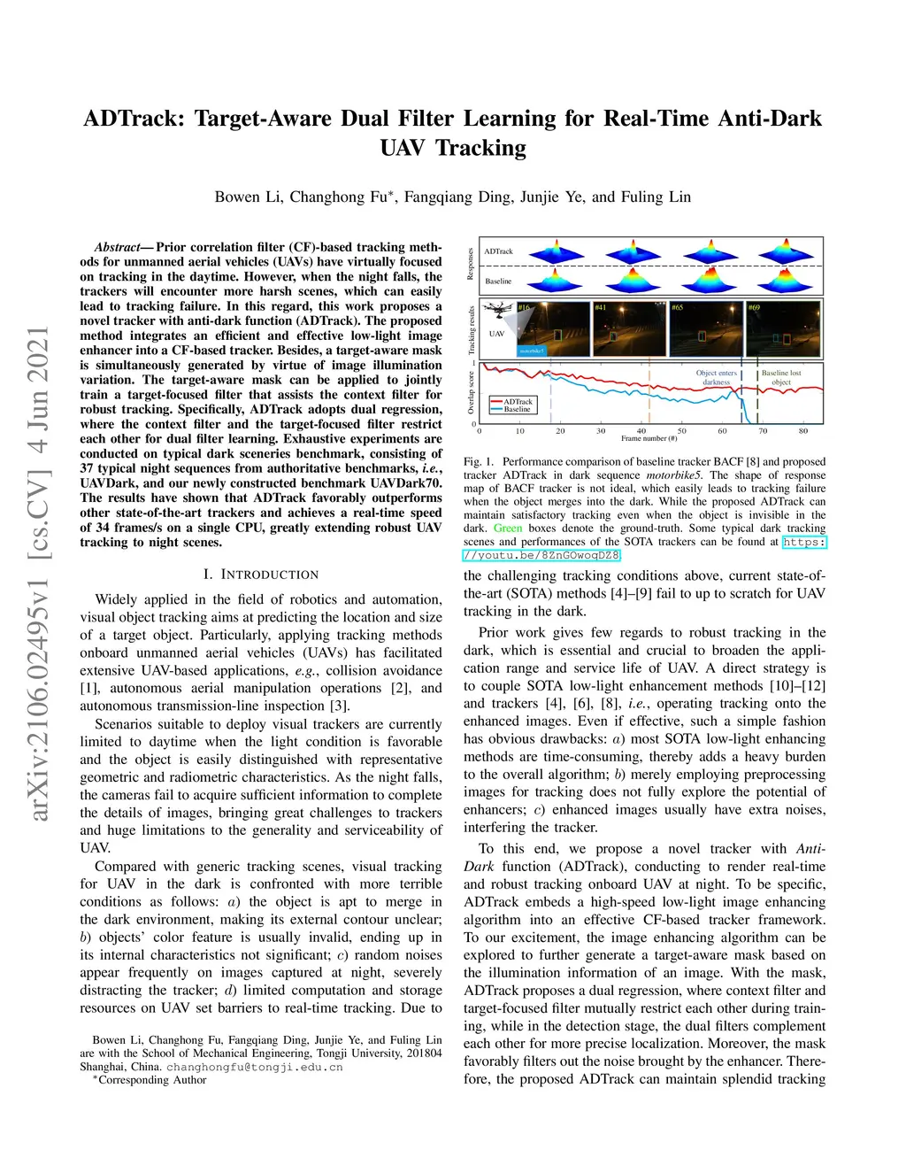 Prior correlation filter (CF)-based tracking methods for unmanned aerial vehicles (UAVs) have virtually focused on tracking in the daytime. However, when the night falls, the trackers will encounter more harsh scenes, which can easily lead to tracking failure. In this regard, this work proposes a novel tracker with anti-dark function (ADTrack). The proposed method integrates an efficient and effective low-light image enhancer into a CF-based tracker. Besides, a target-aware mask is simultaneously generated by virtue of image illumination variation. The target-aware mask can be applied to jointly train a target-focused filter that assists the context filter for robust tracking. Specifically, ADTrack adopts dual regression, where the context filter and the target-focused filter restrict each other for dual filter learning. Exhaustive experiments are conducted on typical dark sceneries benchmark, consisting of 37 typical night sequences from authoritative benchmarks, i.e., UAVDark, and our newly constructed benchmark UAVDark70. The results have shown that ADTrack favorably outperforms other state-of-the-art trackers and achieves a real-time speed of 34 frames/s on a single CPU, greatly extending robust UAV tracking to night scenes.