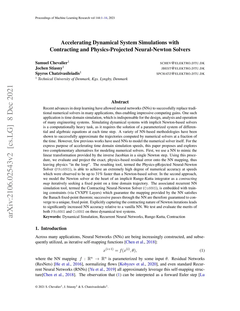 Recent advances in deep learning have allowed neural networks (NNs) to successfully replace traditional numerical solvers in many applications, thus enabling impressive computing gains. One such application is time domain simulation, which is indispensable for the design, analysis and operation of many engineering systems. Simulating dynamical systems with implicit Newton-based solvers is a computationally heavy task, as it requires the solution of a parameterized system of differential and algebraic equations at each time step. A variety of NN-based methodologies have been shown to successfully approximate the trajectories computed by numerical solvers at a fraction of the time. However, few previous works have used NNs to model the numerical solver itself. For the express purpose of accelerating time domain simulation speeds, this paper proposes and explores two complementary alternatives for modeling numerical solvers. First, we use a NN to mimic the linear transformation provided by the inverse Jacobian in a single Newton step. Using this procedure, we evaluate and project the exact, physics-based residual error onto the NN mapping, thus leaving physics ``in the loop''. The resulting tool, termed the Physics-pRojected Neural-Newton Solver (PRoNNS), is able to achieve an extremely high degree of numerical accuracy at speeds which were observed to be up to 31% faster than a Newton-based solver. In the second approach, we model the Newton solver at the heart of an implicit Runge-Kutta integrator as a contracting map iteratively seeking a fixed point on a time domain trajectory. The associated recurrent NN simulation tool, termed the Contracting Neural-Newton Solver (CoNNS), is embedded with training constraints (via CVXPY Layers) which guarantee the mapping provided by the NN satisfies the Banach fixed-point theorem.