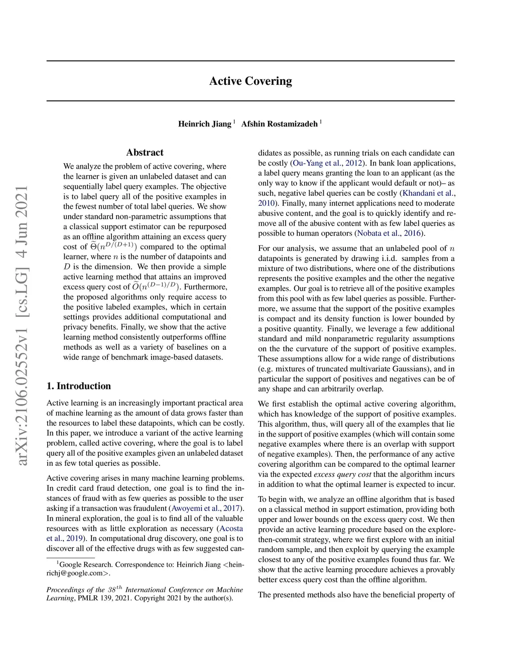 We analyze the problem of active covering, where the learner is given an unlabeled dataset and can sequentially label query examples. The objective is to label query all of the positive examples in the fewest number of total label queries. We show under standard non-parametric assumptions that a classical support estimator can be repurposed as an offline algorithm attaining an excess query cost of compared to the optimal learner, where is the number of datapoints and is the dimension. We then provide a simple active learning method that attains an improved excess query cost of . Furthermore, the proposed algorithms only require access to the positive labeled examples, which in certain settings provides additional computational and privacy benefits. Finally, we show that the active learning method consistently outperforms offline methods as well as a variety of baselines on a wide range of benchmark image-based datasets.