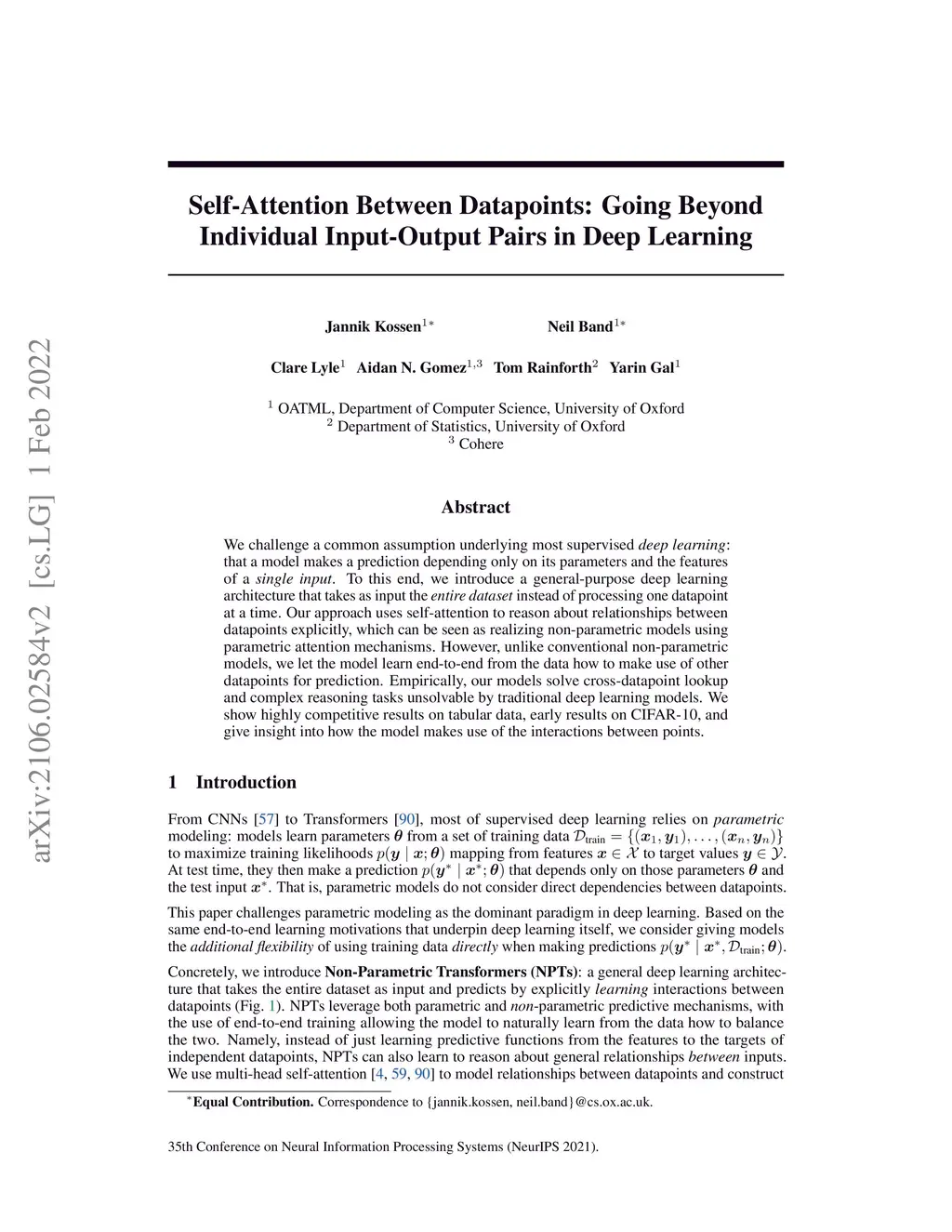We challenge a common assumption underlying most supervised deep learning: that a model makes a prediction depending only on its parameters and the features of a single input. To this end, we introduce a general-purpose deep learning architecture that takes as input the entire dataset instead of processing one datapoint at a time. Our approach uses self-attention to reason about relationships between datapoints explicitly, which can be seen as realizing non-parametric models using parametric attention mechanisms. However, unlike conventional non-parametric models, we let the model learn end-to-end from the data how to make use of other datapoints for prediction. Empirically, our models solve cross-datapoint lookup and complex reasoning tasks unsolvable by traditional deep learning models. We show highly competitive results on tabular data, early results on CIFAR-10, and give insight into how the model makes use of the interactions between points.