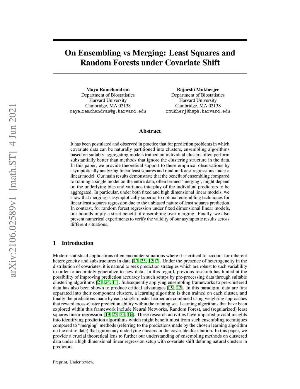 It has been postulated and observed in practice that for prediction problems in which covariate data can be naturally partitioned into clusters, ensembling algorithms based on suitably aggregating models trained on individual clusters often perform substantially better than methods that ignore the clustering structure in the data. In this paper, we provide theoretical support to these empirical observations by asymptotically analyzing linear least squares and random forest regressions under a linear model. Our main results demonstrate that the benefit of ensembling compared to training a single model on the entire data, often termed 'merging', might depend on the underlying bias and variance interplay of the individual predictors to be aggregated. In particular, under both fixed and high dimensional linear models, we show that merging is asymptotically superior to optimal ensembling techniques for linear least squares regression due to the unbiased nature of least squares prediction. In contrast, for random forest regression under fixed dimensional linear models, our bounds imply a strict benefit of ensembling over merging. Finally, we also present numerical experiments to verify the validity of our asymptotic results across different situations.