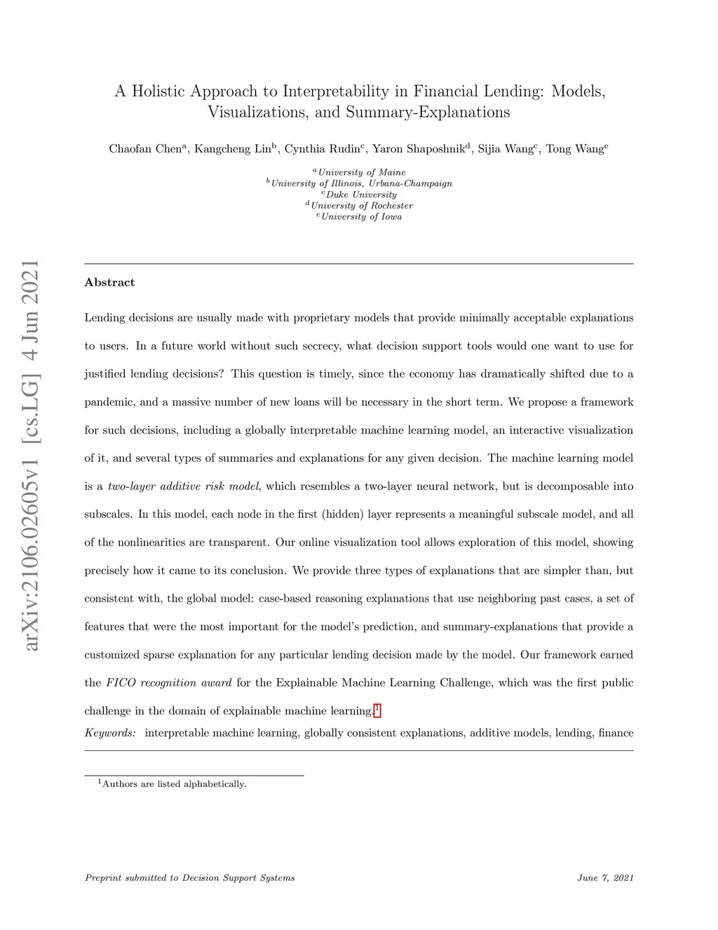 Lending decisions are usually made with proprietary models that provide minimally acceptable explanations to users. In a future world without such secrecy, what decision support tools would one want to use for justified lending decisions? This question is timely, since the economy has dramatically shifted due to a pandemic, and a massive number of new loans will be necessary in the short term. We propose a framework for such decisions, including a globally interpretable machine learning model, an interactive visualization of it, and several types of summaries and explanations for any given decision. The machine learning model is a two-layer additive risk model, which resembles a two-layer neural network, but is decomposable into subscales. In this model, each node in the first (hidden) layer represents a meaningful subscale model, and all of the nonlinearities are transparent. Our online visualization tool allows exploration of this model, showing precisely how it came to its conclusion. We provide three types of explanations that are simpler than, but consistent with, the global model: case-based reasoning explanations that use neighboring past cases, a set of features that were the most important for the model's prediction, and summary-explanations that provide a customized sparse explanation for any particular lending decision made by the model. Our framework earned the FICO recognition award for the Explainable Machine Learning Challenge, which was the first public challenge in the domain of explainable machine learning.