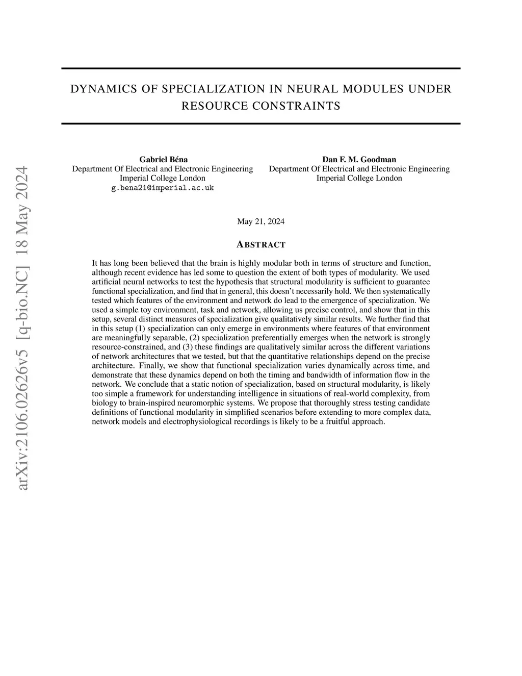 It has long been believed that the brain is highly modular both in terms of structure and function, although recent evidence has led some to question the extent of both types of modularity. We used artificial neural networks to test the hypothesis that structural modularity is sufficient to guarantee functional specialization, and find that in general, this doesn't necessarily hold. We then systematically tested which features of the environment and network do lead to the emergence of specialization. We used a simple toy environment, task and network, allowing us precise control, and show that in this setup, several distinct measures of specialization give qualitatively similar results. We further find that in this setup (1) specialization can only emerge in environments where features of that environment are meaningfully separable, (2) specialization preferentially emerges when the network is strongly resource-constrained, and (3) these findings are qualitatively similar across the different variations of network architectures that we tested, but that the quantitative relationships depend on the precise architecture. Finally, we show that functional specialization varies dynamically across time, and demonstrate that these dynamics depend on both the timing and bandwidth of information flow in the network. We conclude that a static notion of specialization, based on structural modularity, is likely too simple a framework for understanding intelligence in situations of real-world complexity, from biology to brain-inspired neuromorphic systems. We propose that thoroughly stress testing candidate definitions of functional modularity in simplified scenarios before extending to more complex data, network models and electrophysiological recordings is likely to be a fruitful approach.
