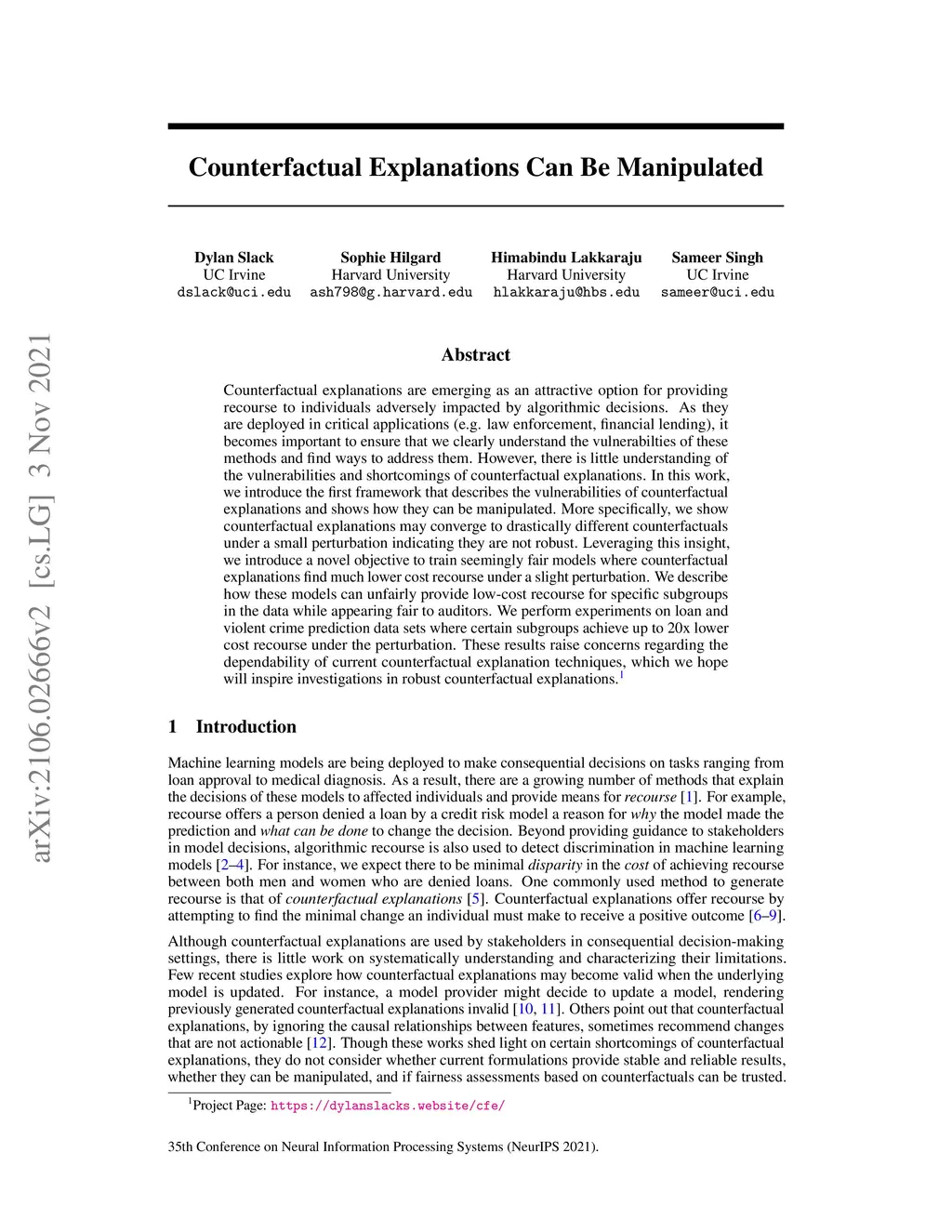 Counterfactual explanations are emerging as an attractive option for providing recourse to individuals adversely impacted by algorithmic decisions. As they are deployed in critical applications (e.g. law enforcement, financial lending), it becomes important to ensure that we clearly understand the vulnerabilities of these methods and find ways to address them. However, there is little understanding of the vulnerabilities and shortcomings of counterfactual explanations. In this work, we introduce the first framework that describes the vulnerabilities of counterfactual explanations and shows how they can be manipulated. More specifically, we show counterfactual explanations may converge to drastically different counterfactuals under a small perturbation indicating they are not robust. Leveraging this insight, we introduce a novel objective to train seemingly fair models where counterfactual explanations find much lower cost recourse under a slight perturbation. We describe how these models can unfairly provide low-cost recourse for specific subgroups in the data while appearing fair to auditors. We perform experiments on loan and violent crime prediction data sets where certain subgroups achieve up to 20x lower cost recourse under the perturbation. These results raise concerns regarding the dependability of current counterfactual explanation techniques, which we hope will inspire investigations in robust counterfactual explanations.