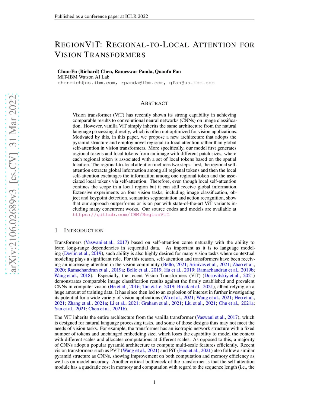 Vision transformer (ViT) has recently shown its strong capability in achieving comparable results to convolutional neural networks (CNNs) on image classification. However, vanilla ViT simply inherits the same architecture from the natural language processing directly, which is often not optimized for vision applications. Motivated by this, in this paper, we propose a new architecture that adopts the pyramid structure and employ a novel regional-to-local attention rather than global self-attention in vision transformers. More specifically, our model first generates regional tokens and local tokens from an image with different patch sizes, where each regional token is associated with a set of local tokens based on the spatial location. The regional-to-local attention includes two steps: first, the regional self-attention extract global information among all regional tokens and then the local self-attention exchanges the information among one regional token and the associated local tokens via self-attention. Therefore, even though local self-attention confines the scope in a local region but it can still receive global information. Extensive experiments on four vision tasks, including image classification, object and keypoint detection, semantics segmentation and action recognition, show that our approach outperforms or is on par with state-of-the-art ViT variants including many concurrent works. Our source codes and models are available at https://github.com/ibm/regionvit.